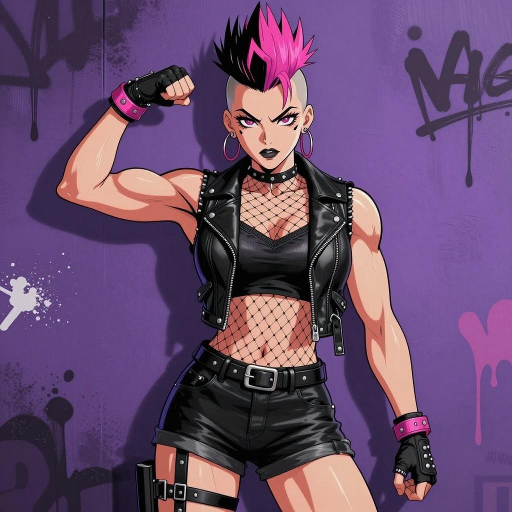 A confident punk woman with red mohawk hairstyle and edgy makeup, wearing a black leather jacket, fishnet top, black shorts, and gloves, standing against a graffiti-covered wall with the word 'BLOOD' visible, anime style, edgy punk, bold lines, vibrant color contrast, cel shading, sharp details, red and black color scheme