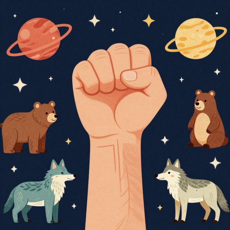 Retro Toys looking at closed fist raised in the air background is space with stars and planets and bears and wolves in a native art style,