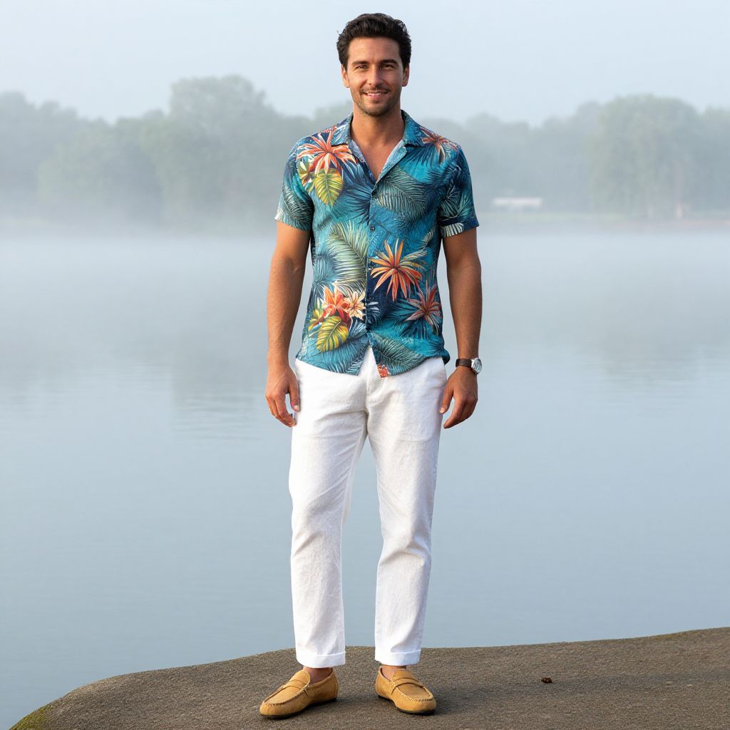 A man, tropical print short-sleeve shirt, white linen chinos, tan leather loafers, serene lake edge, misty morning fog, vibrant colors, relaxed smile, carefree expression Man has masculine face and piercing eyes