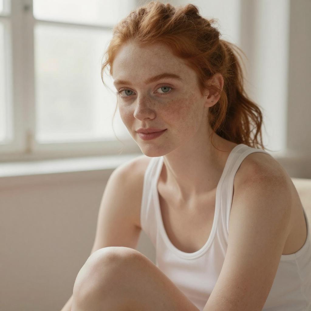 Photograph of a fair-skinned, red-haired young woman with freckles, wearing a white tank top, sitting on a bed in a sun
