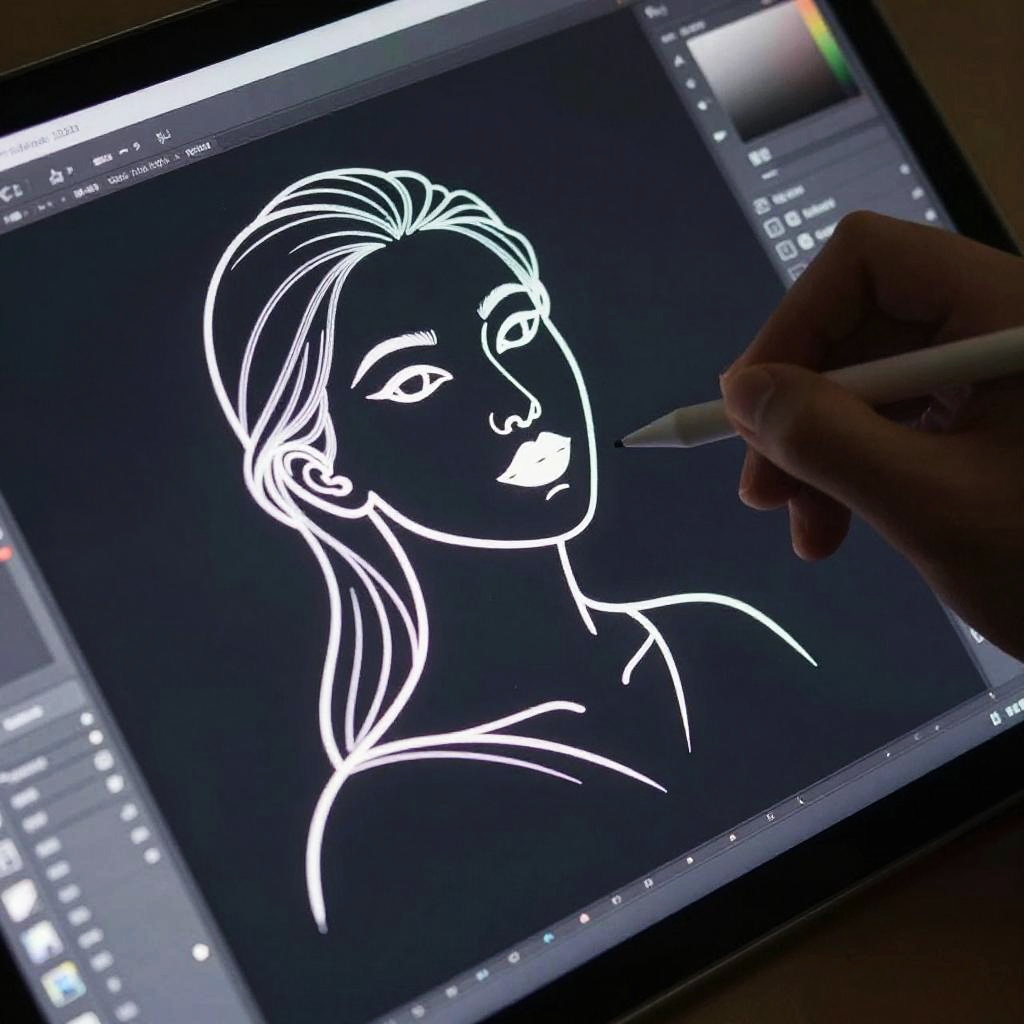 Close-up of lineart maker software in action, hand holding stylus drawing a dynamic, flowing lineart portrait with elegant curves, digital screen illuminated with sharp white lines on dark background, futuristic workstation environment, high resolution render.