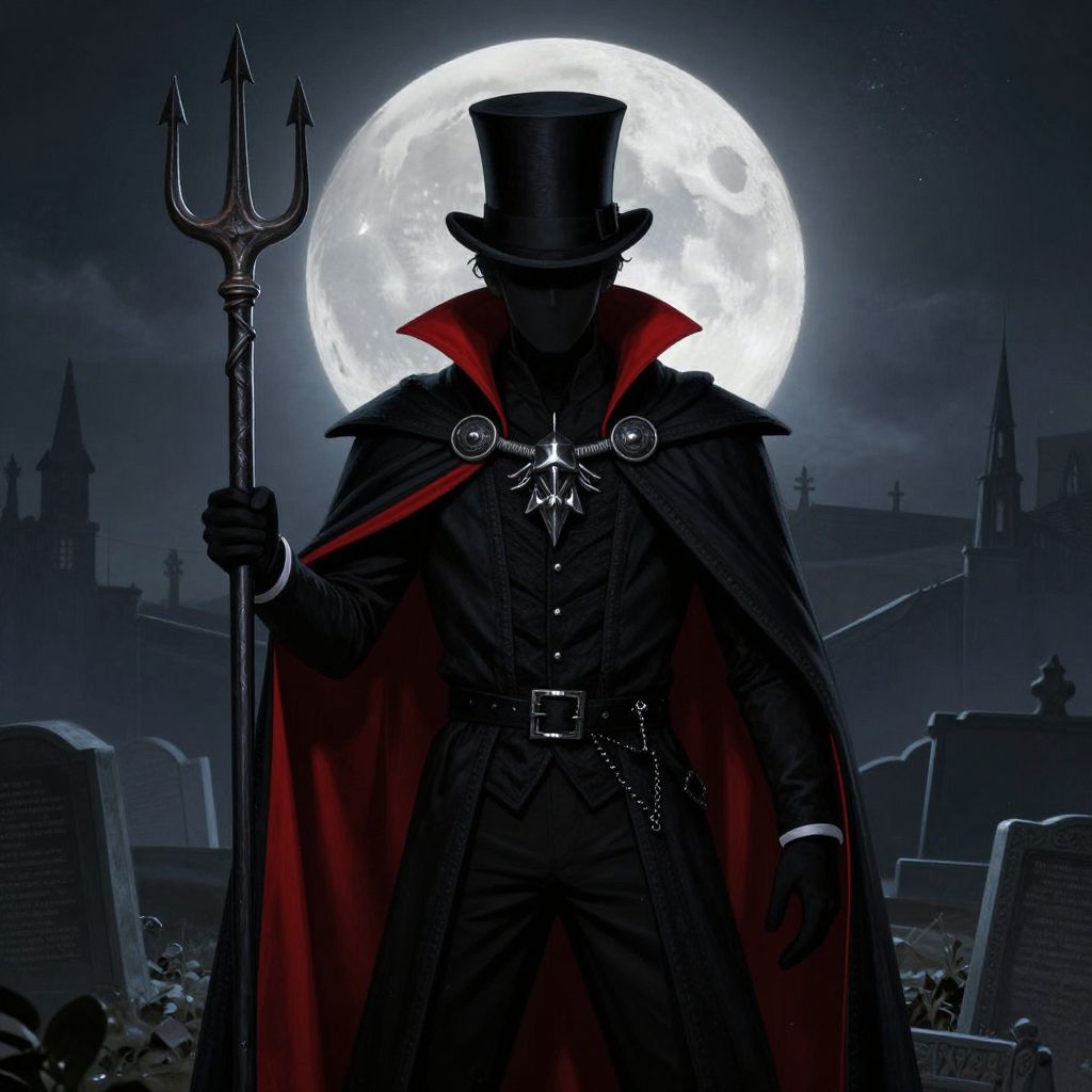 A mysterious man in a cemetery on a full moon night wearing a top hat that hides!! his face and a beautiful black and red cape while holding a poseidon trident, digital art. digital painting, moonlight, detailed.