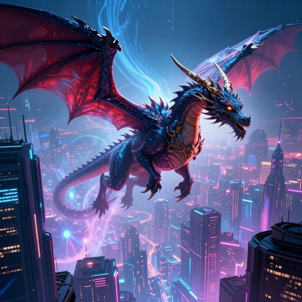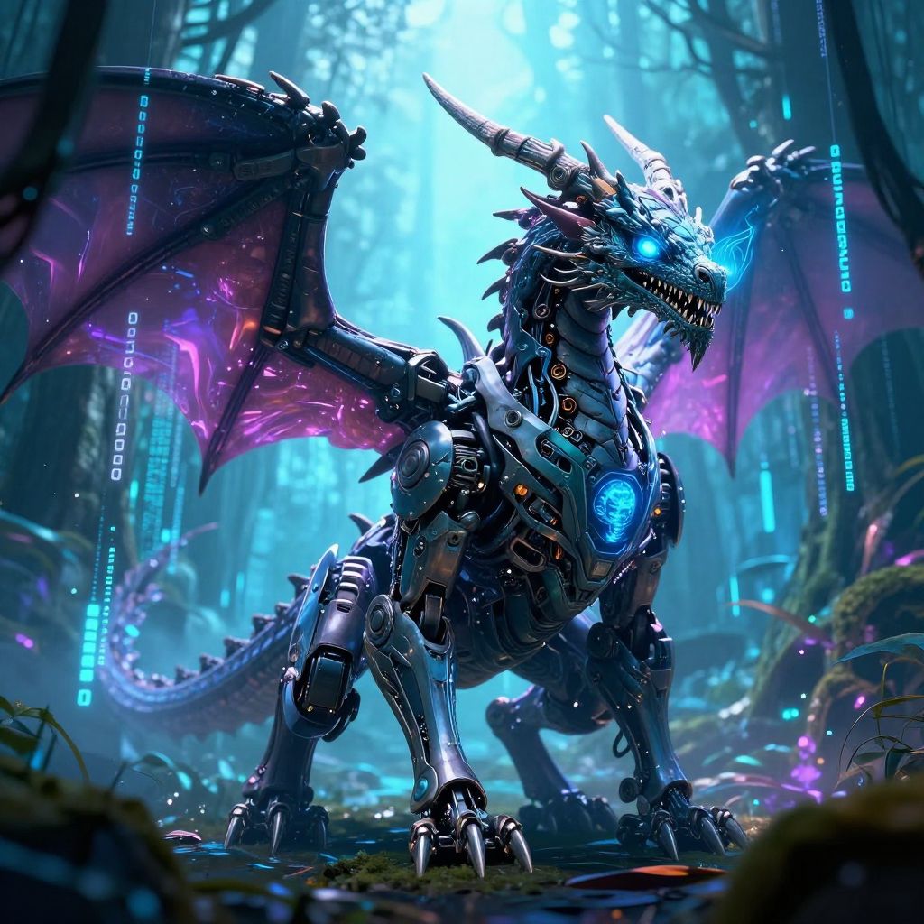 AI generated dragon emerging from a swirling vortex of data streams and holographic code, digital pixels forming its majestic body, glowing eyes scanning the horizon, sci-fi fantasy fusion, vivid blues and purples, highly detailed, glowing effects, cinematic composition.