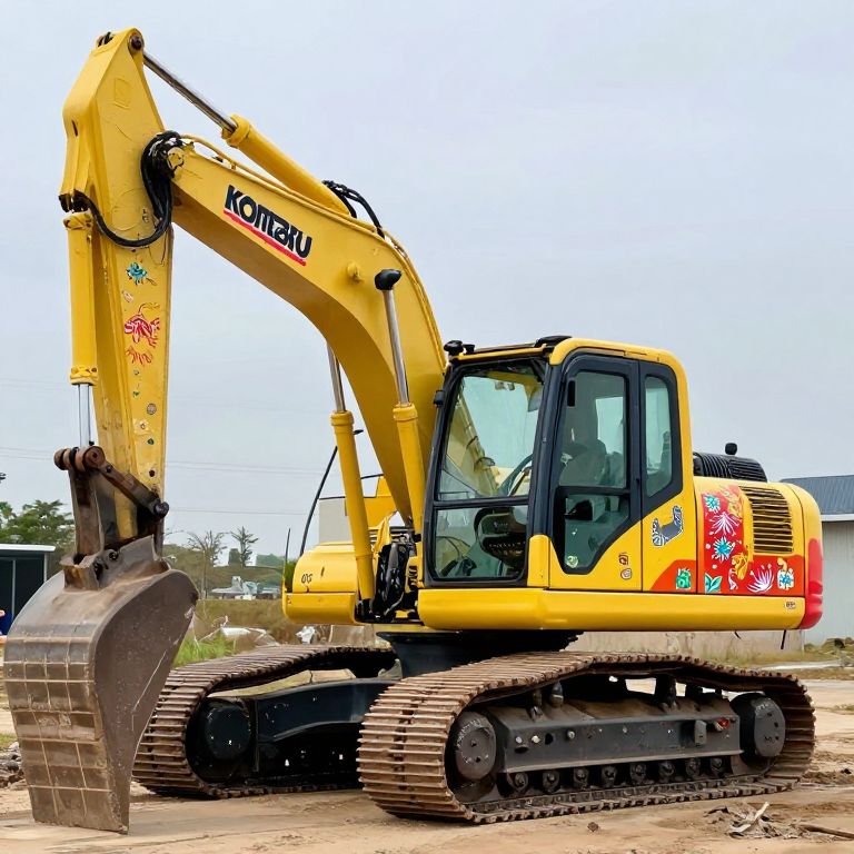 The image showcases a vibrantly painted Komatsu HB365LC/NLC-3 Hybrid excavator, adorned with intricate folk art designs. The excavator's arm, painted in shades of yellow and blue with floral patterns, stands out against the dark background. The cabin, painted in a striking blue with red and yellow accents, features a large window and a door with colorful designs. The excavator's tracks and undercarriage are painted in a combination of yellow and black, with additional colorful patterns. The overall composition is balanced, with the excavator positioned centrally, and the folk art designs adding a sense of depth and complexity to the scene. The interplay of colors and textures creates a visually engaging and dynamic image.
