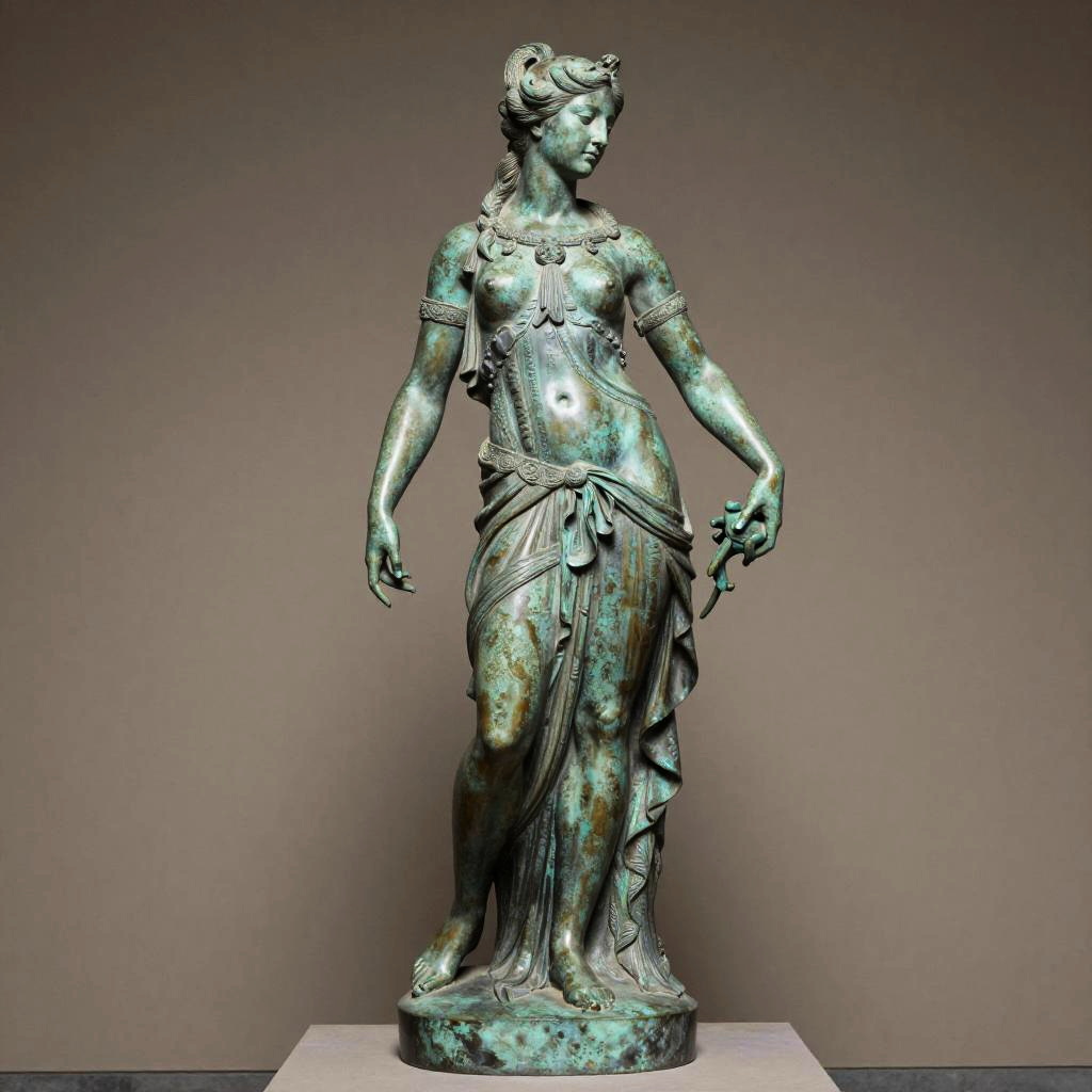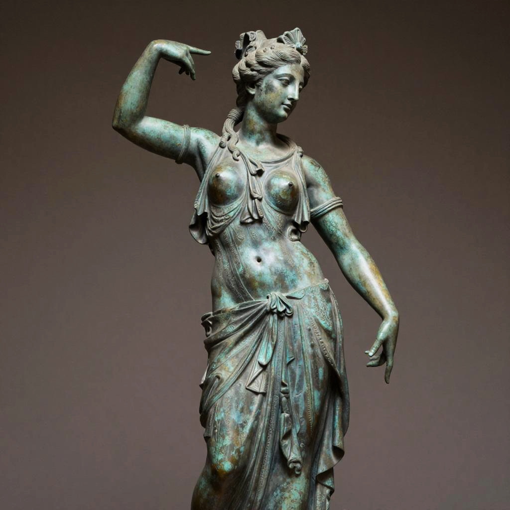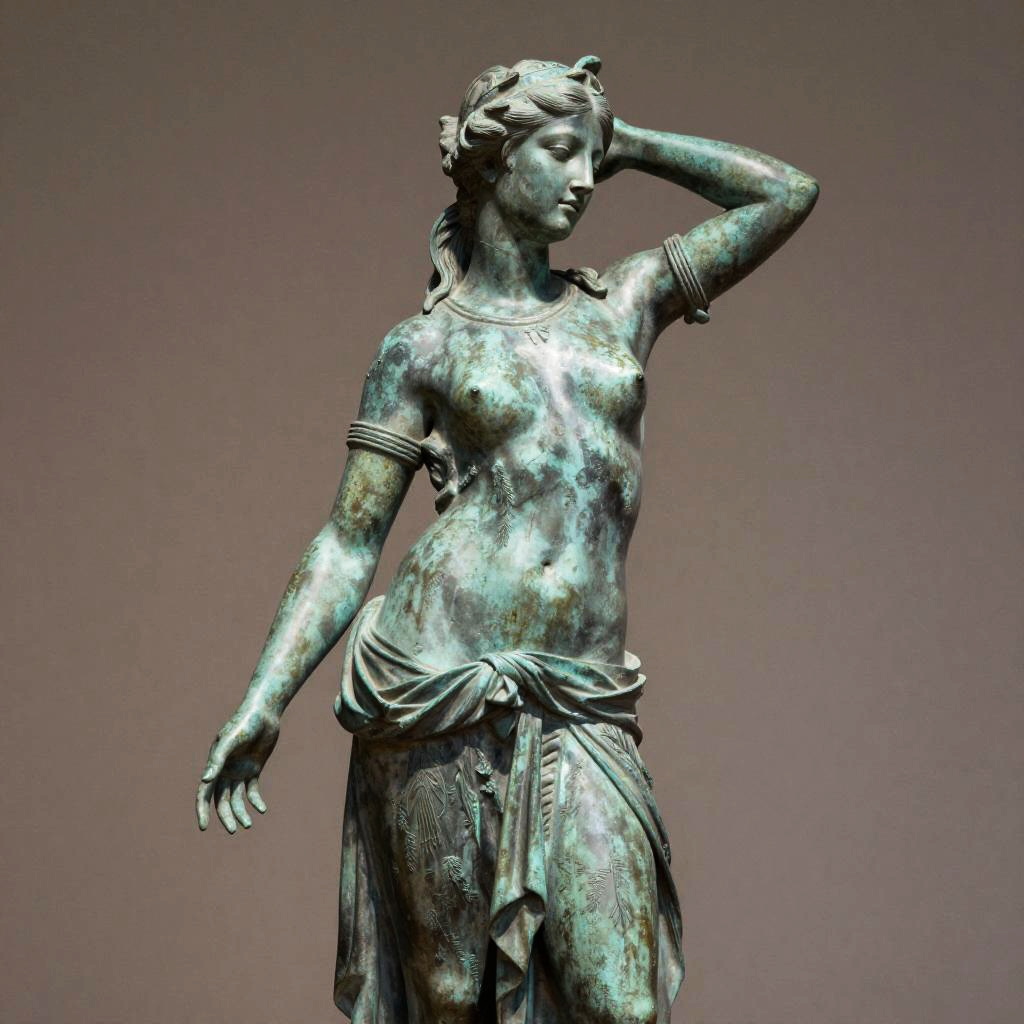 Detailed photo of an old bronze patina statue of a beautiful seducing ancient priestess, full body portrait, various seductive poses, photorealism, intricate detail, museum diffuse lighting