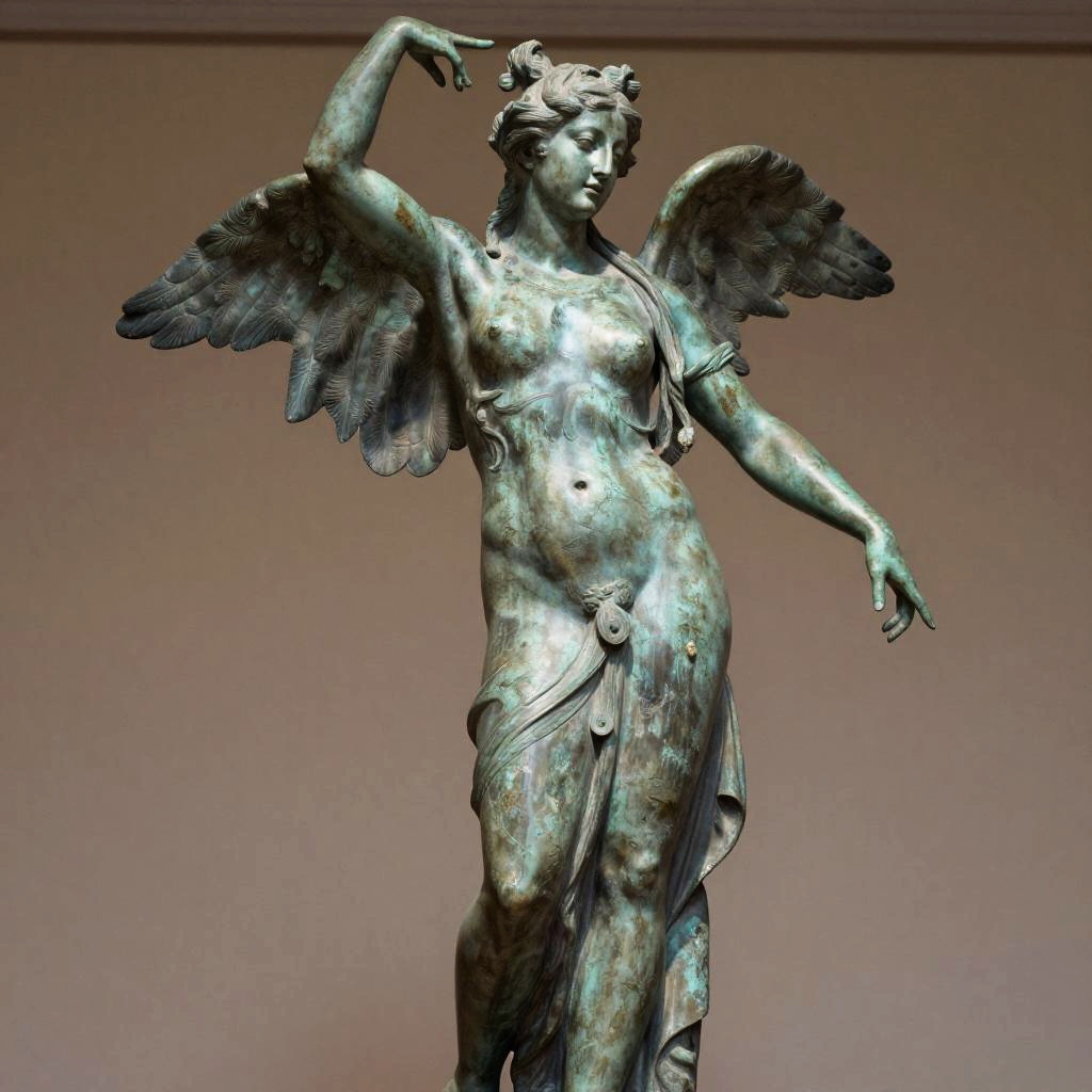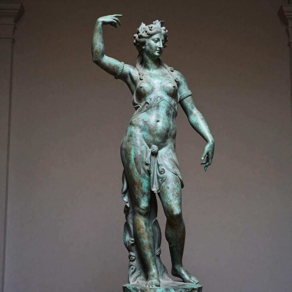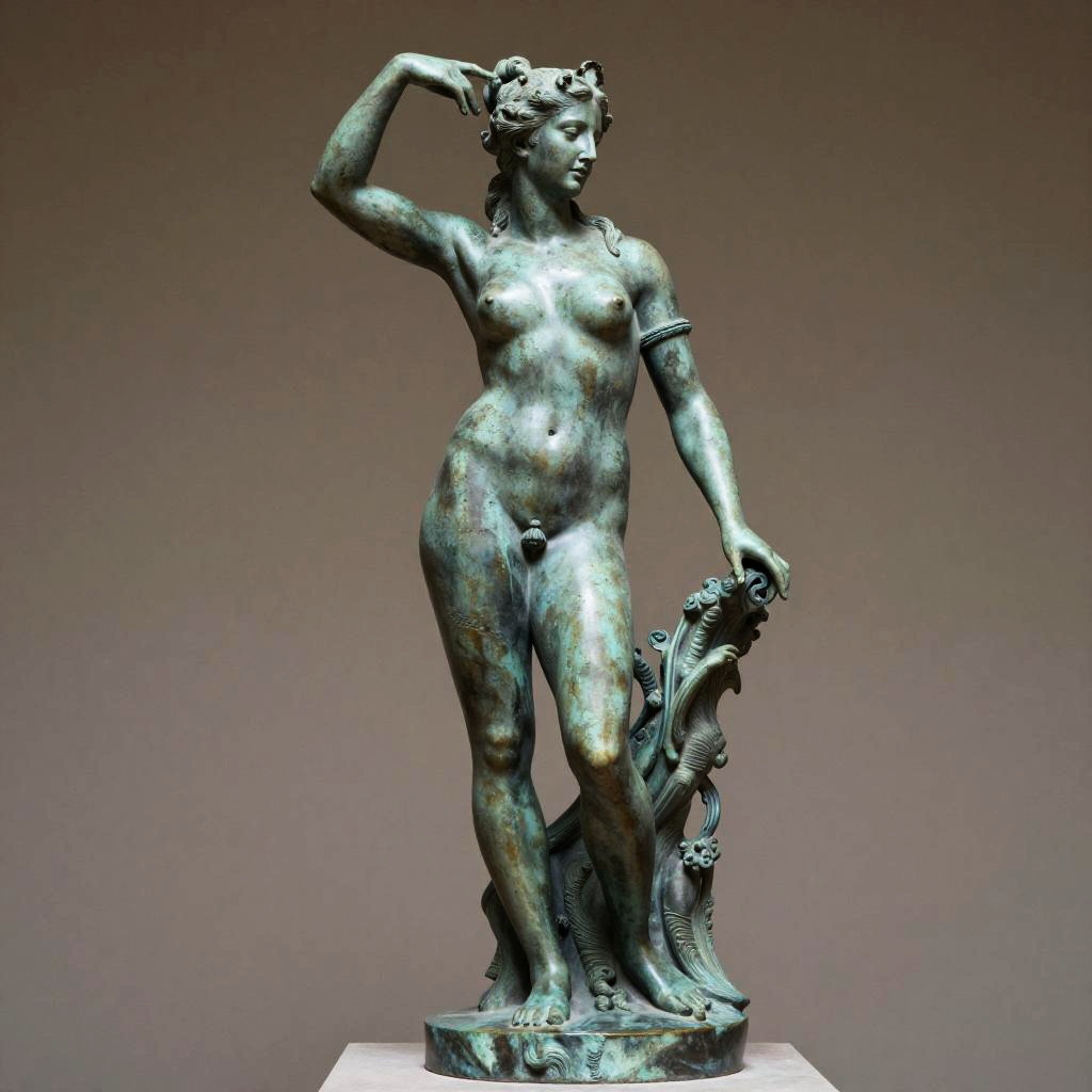 Detailed photo of an old bronze patina statue of a beautiful seducing ancient priestess, full body portrait, various seductive poses, photorealism, intricate detail, museum diffuse lighting