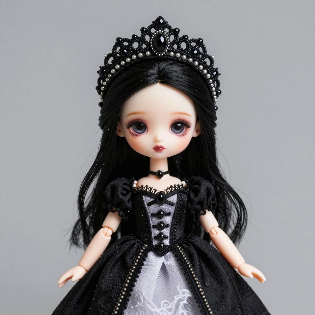 This striking image features a beautifully crafted doll adorned with intricate details and an elaborate headpiece. The combination of dark and light elements in her attire, complemented by flowing black hair, creates a captivating and gothic aesthetic. The overall composition conveys a sense of elegance and fantasy.