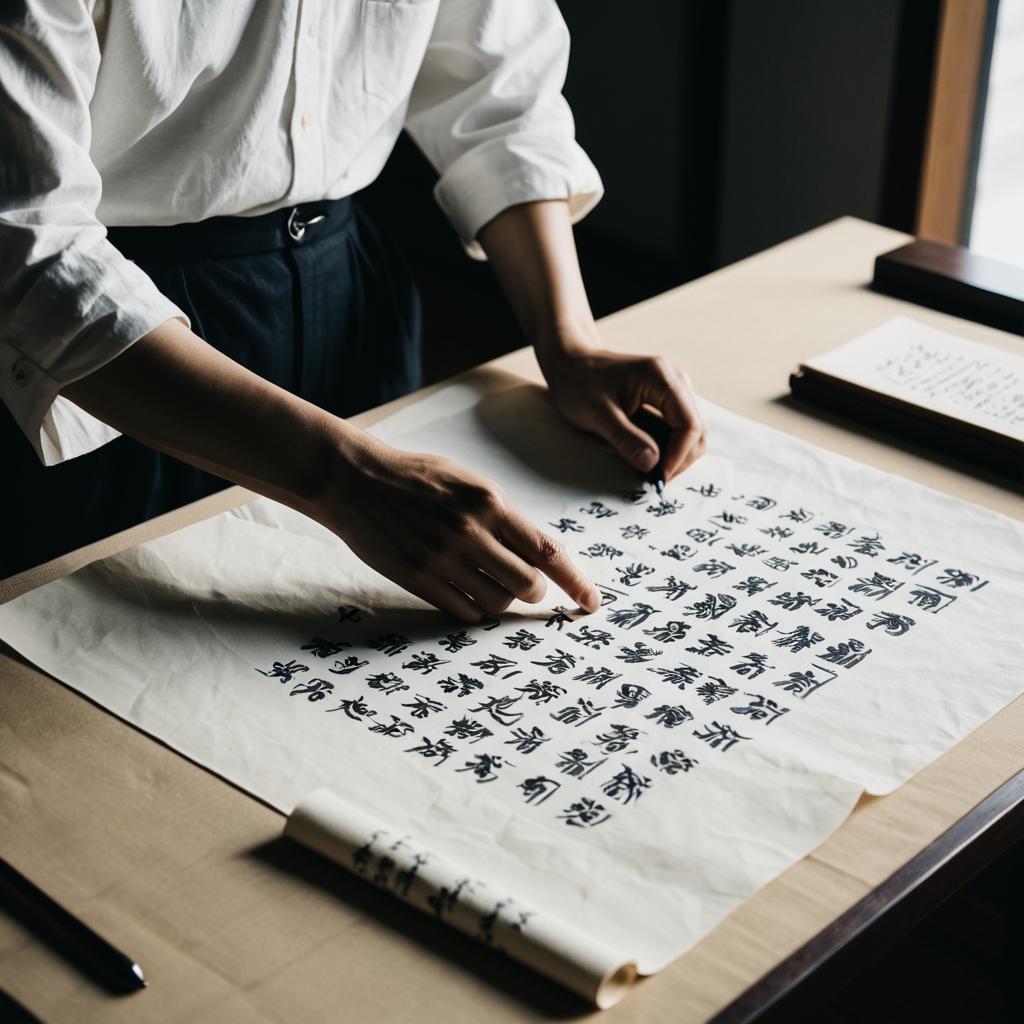 Korean modern calligrapher, medium shot, minimalist clothing, ink-stained hands, traditional paper scroll, indoor daylight, documentary realism, Fujifilm X-T4, F/2.8, ISO 320, 8K, cinematic lighting.