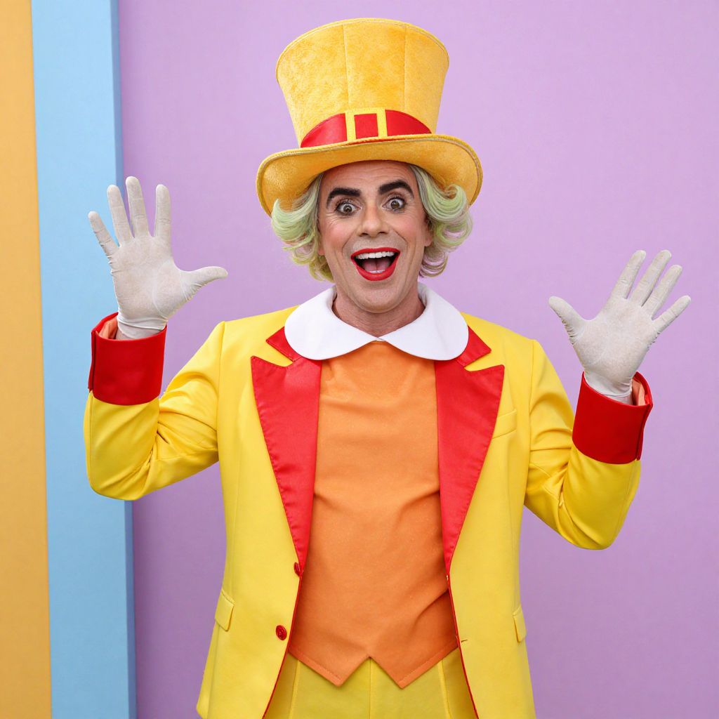 Photograph of a person dressed in a vibrant, theatrical clown costume. They wear a bright yellow top hat with a red band, a matching yellow jacket with red lapels, and a white-collared orange shirt. Their outfit is completed with white gloves and yellow pants. They have curly blonde wig and exaggeratedly wide, expressive eyes, with an open-mouthed smile. Both hands are raised, palms facing outward. The background features soft, pastel colors, with a vertical gradient from blue to purple on the left and a yellow stripe on the right. The image is brightly lit, emphasizing the vivid colors of the costume.