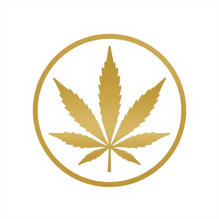 A gold cannabis leaf logo with a circular outline on a blank white background.