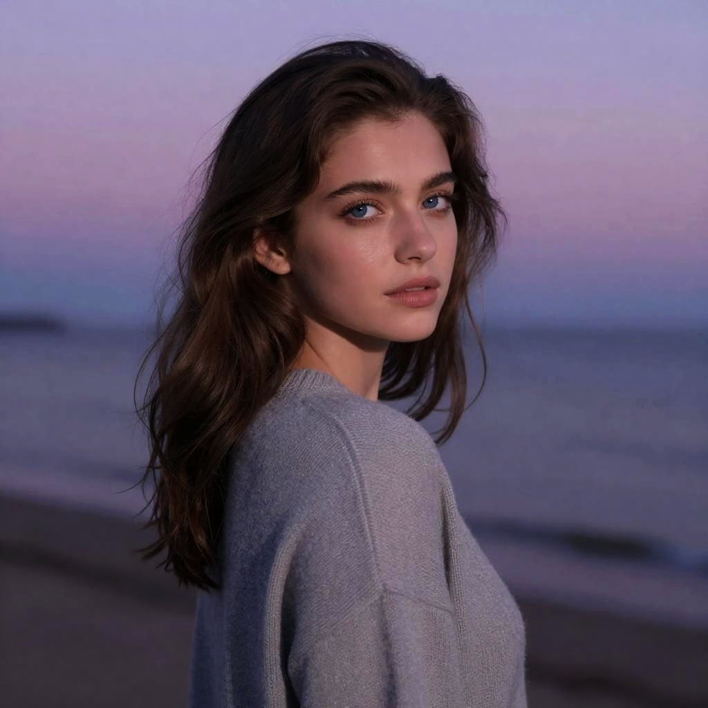 Photograph of a young woman with long brown hair blowing in the wind, wearing a blue and white striped shirt. She has a serious expression and is standing in front of a blurry, turquoise ocean background.