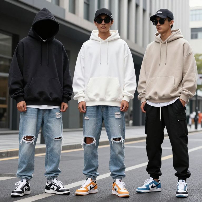 Stylish streetwear for every season, showcasing a curated collection of oversized hoodies, distressed denim, and colorful sneakers, styled with a mix of casual and bold accessories, against a backdrop of city streets and modern architecture.