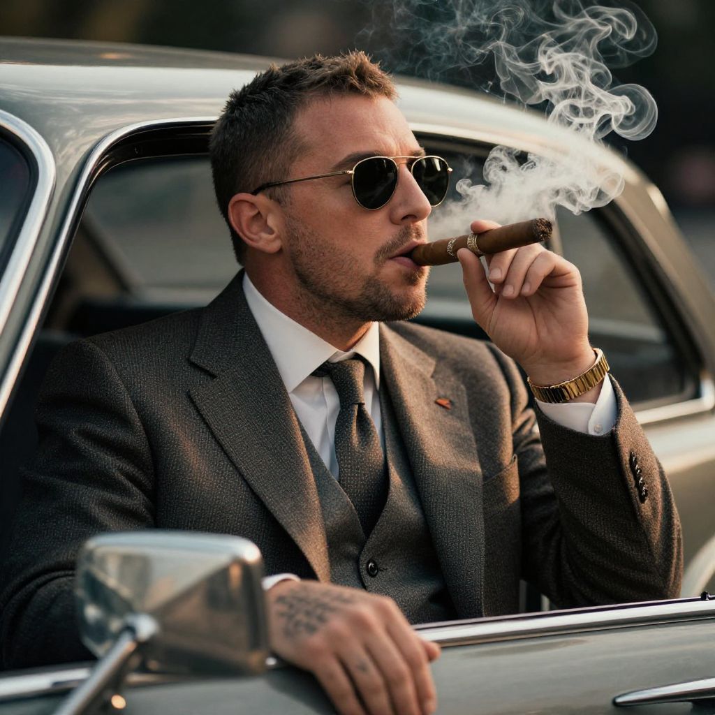 Andrew Tate smoking cigar in a classic vintage car, wearing tailored suit and shades, smoke curling elegantly, moody lighting with warm tones, high detail realism