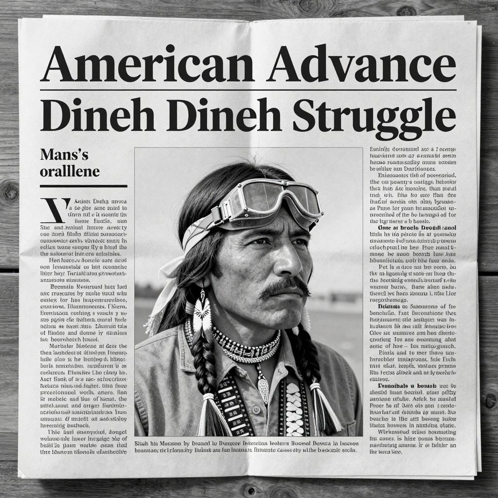 Black-and-white photograph of a Native American man with a mustache, wearing a headscarf, braided hair, goggles on forehead, traditional beaded necklace, and feather earrings. The image is centered on a vintage newspaper page with headlines mentioning 'American Advance' and 'Dineh Dineh Struggle.' Text surrounds the portrait on a wooden surface background.