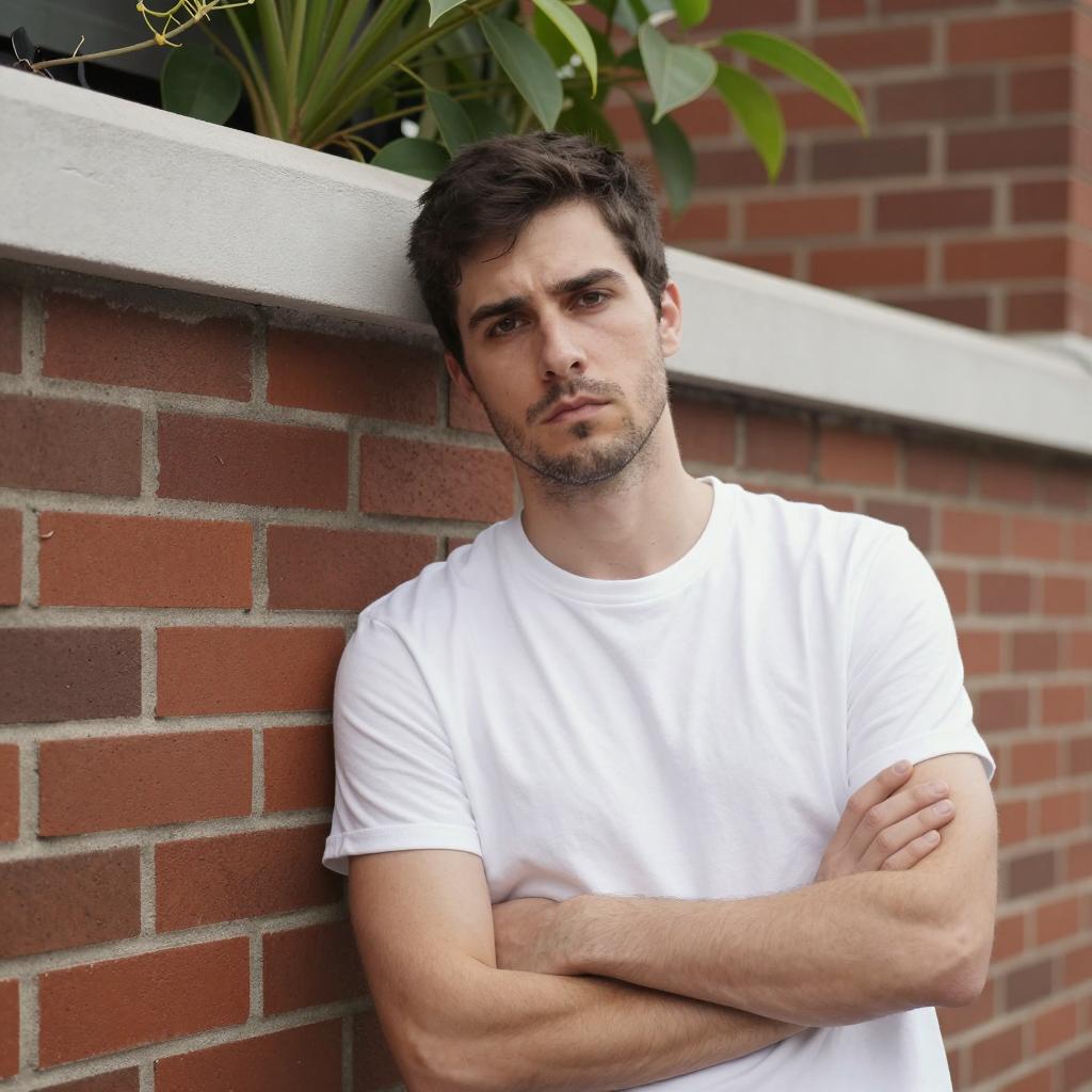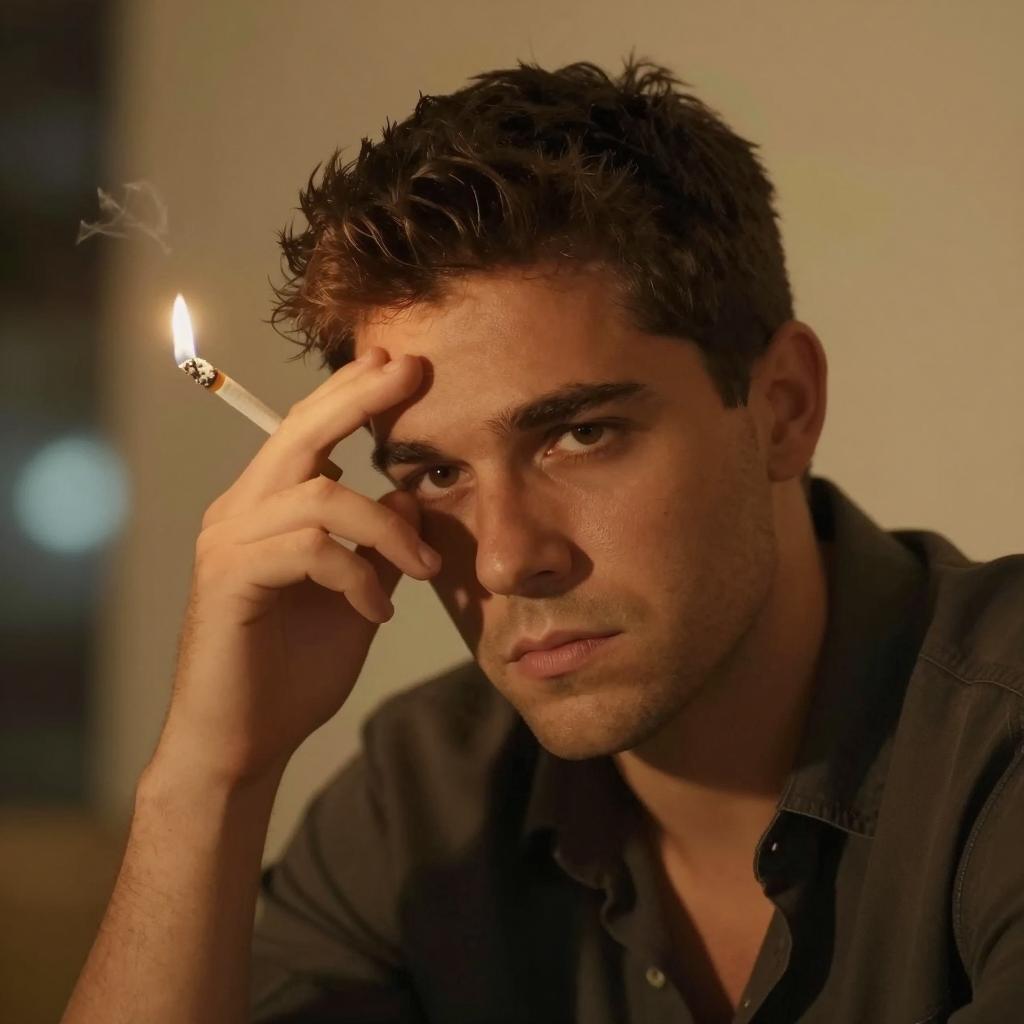Photograph of a handsome man with short, dark brown hair, holding a lit cigarette to his forehead. He has a serious expression, wearing a dark shirt. Warm orange and yellow lighting in the background. Blurred lights create a soft glow. Close-up shot.