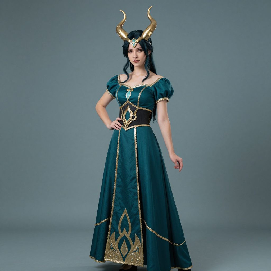A woman dressed in a realistic Eris cosplay costume stands confidently against a muted teal background. She wears a detailed teal gown accented with gold trim and an ornate belt, complemented by intricate golden horn headwear, embodying a fantasy character with elegance and poise.