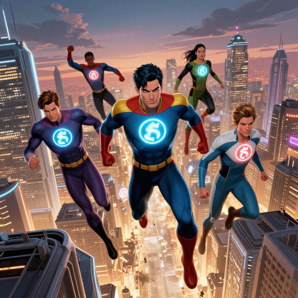 Superhéroes soaring through a futuristic cityscape at dusk, clad in vibrant costumes with glowing emblems, dynamic action poses, dramatic lighting highlighting their power and determination, comic book style with rich colors and intricate details.