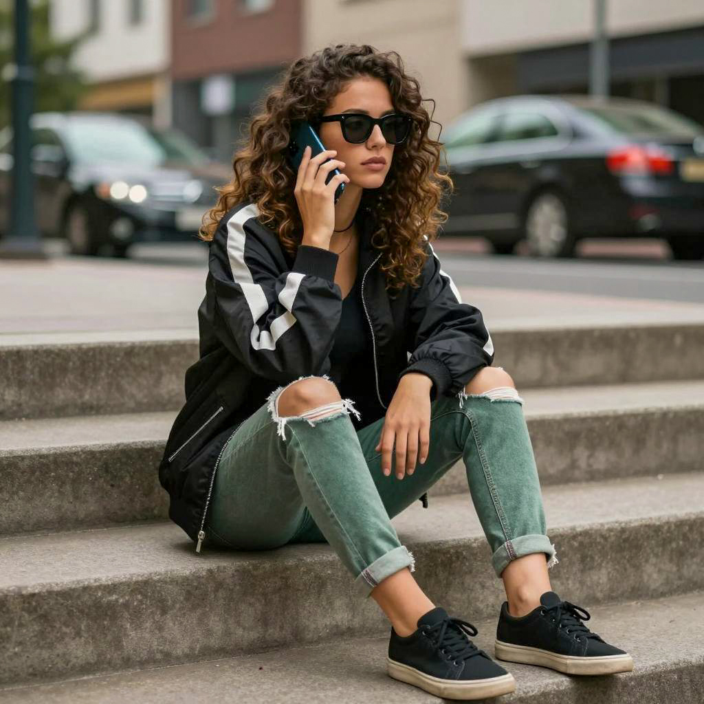 Blonde woman with ponytail, navy cap, white t-shirt, black pants, and white sneakers, sits on wooden chair, holding phone to her ear, left leg crossed over right, right hand on wooden table with iced coffee, grey ured wall background.