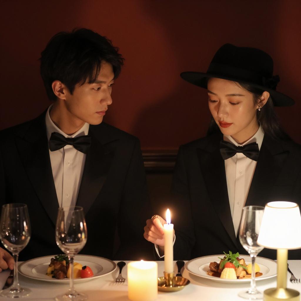 Two Asian men dressed in dark suits and ties sit at a formal dining table holding wine glasses, one with red wine and the other with white wine. The elegant table features lit candles, a floral centerpiece with roses, wine glasses, and plates. In the background, a large framed landscape painting hangs on the wall between bookshelves filled with books, creating a sophisticated atmosphere.