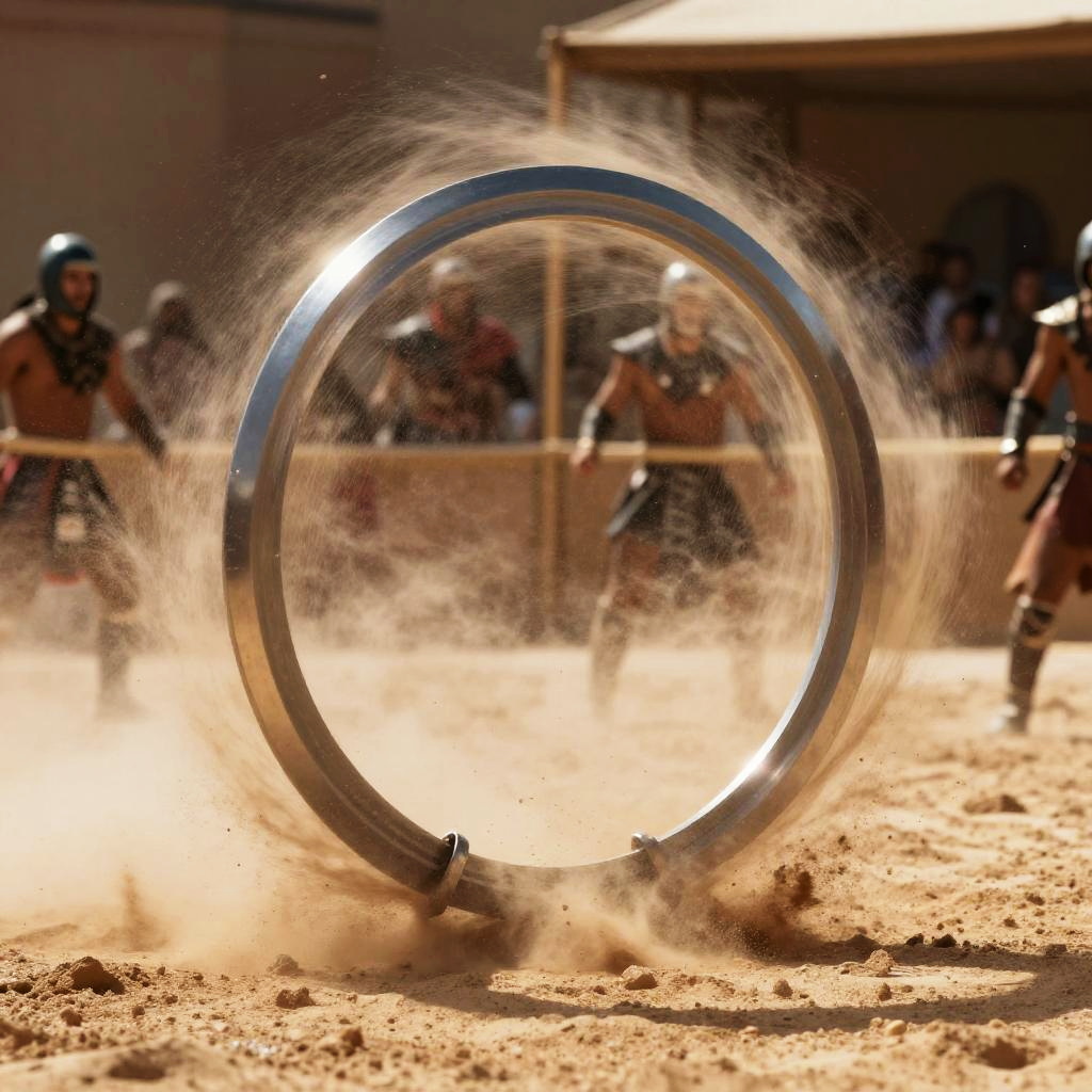 Circular sword spinning rapidly, creating shockwaves in desert arena, dust and sand swirling around, intense gladiator fight atmosphere, dramatic lighting highlighting metallic blade