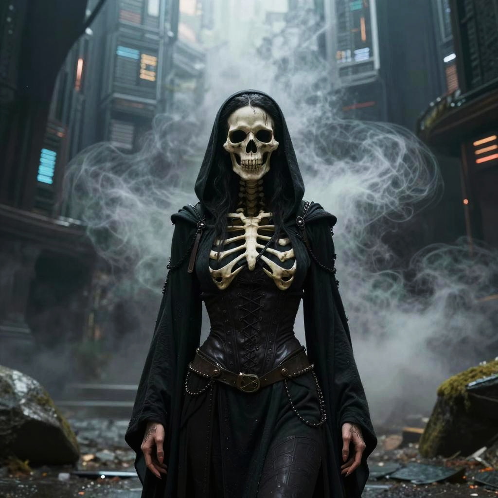 Photo realistic, ultra details, natural light ultra detailed portrait of a female necromancer, skeleton face volumetric fog, Hyperrealism, breathtaking, ultra realistic, ultra detailed, cyber background, cinematic lighting, highly detailed, photography, stunning environment, wide-angle", "text_l": "photo realistic, wide-angle