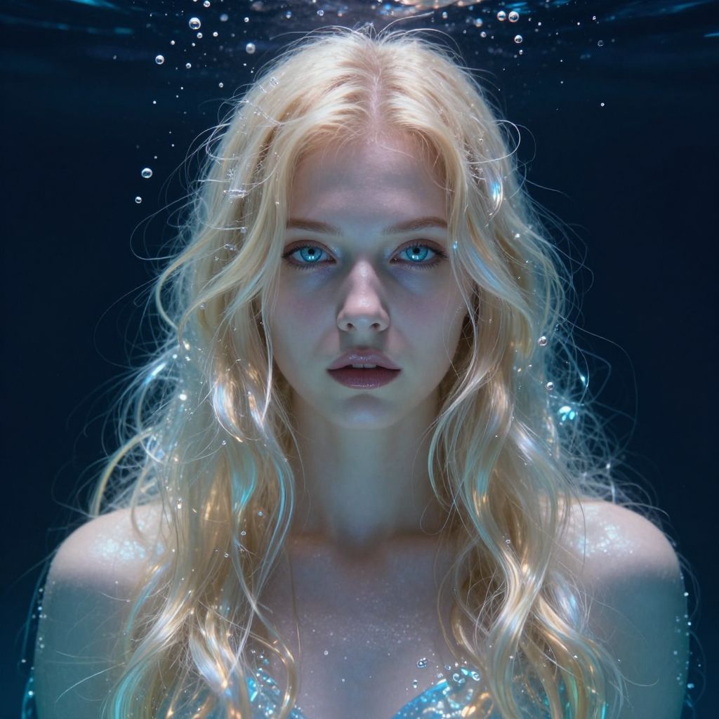 Photograph of a young woman with long, wavy, platinum blonde hair and striking blue eyes, set against a dark, underwater-like background. Her pale skin is illuminated by soft, ethereal light, highlighting her delicate features and giving her an almost otherworldly appearance. Her lips are slightly parted, and she gazes directly at the camera with a serene, yet intense expression. Tiny bubbles surround her head, adding to the underwater effect. She wears a sparkling, blue sequined top that catches the light. The overall mood is mystical and enchanting.