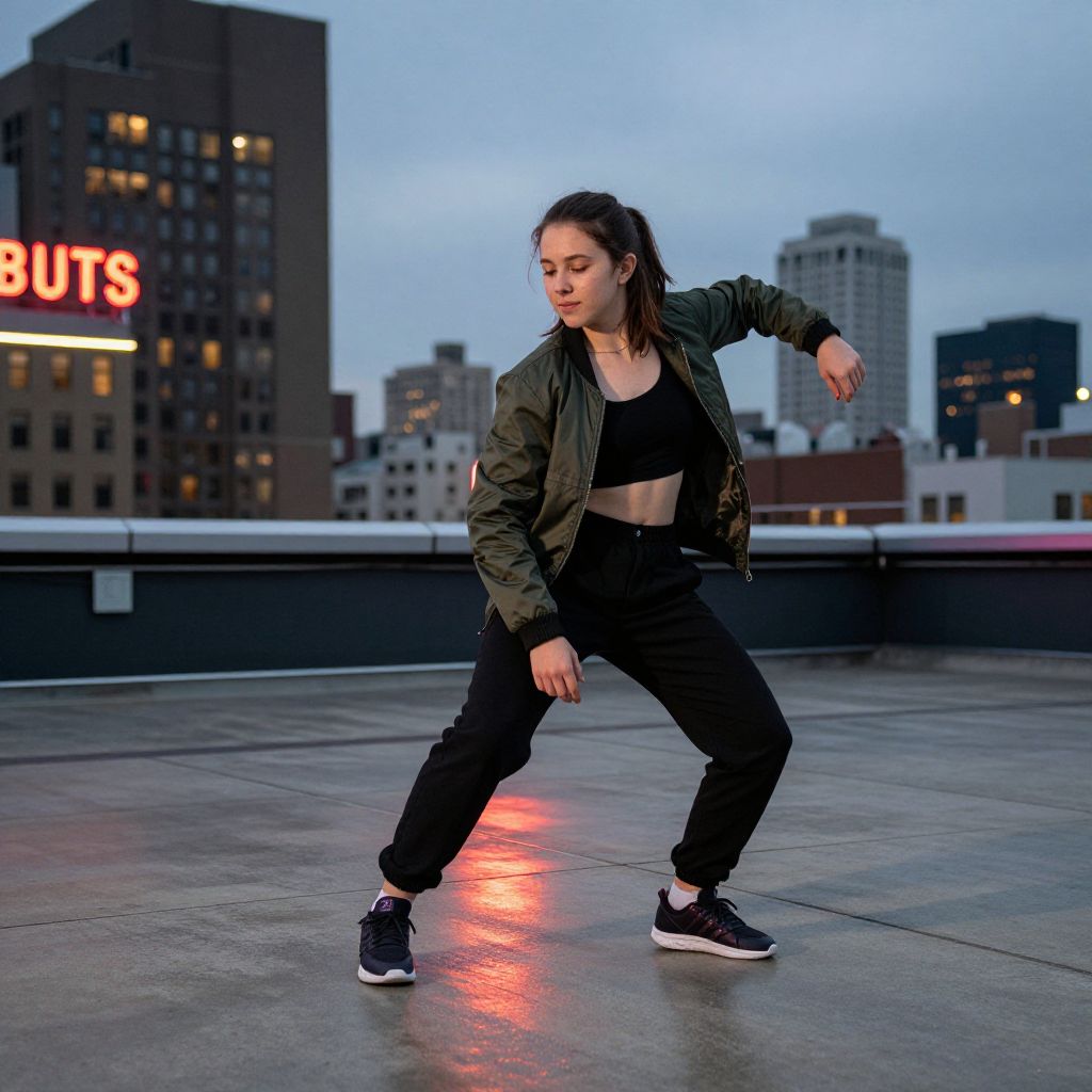 A young woman in her early 20s with subtle freckles and a peaceful expression executes a solo urban dance routine on a concrete rooftop in a cityscape at dusk, the neon signs of the city reflecting in her dark shoes and jacket.