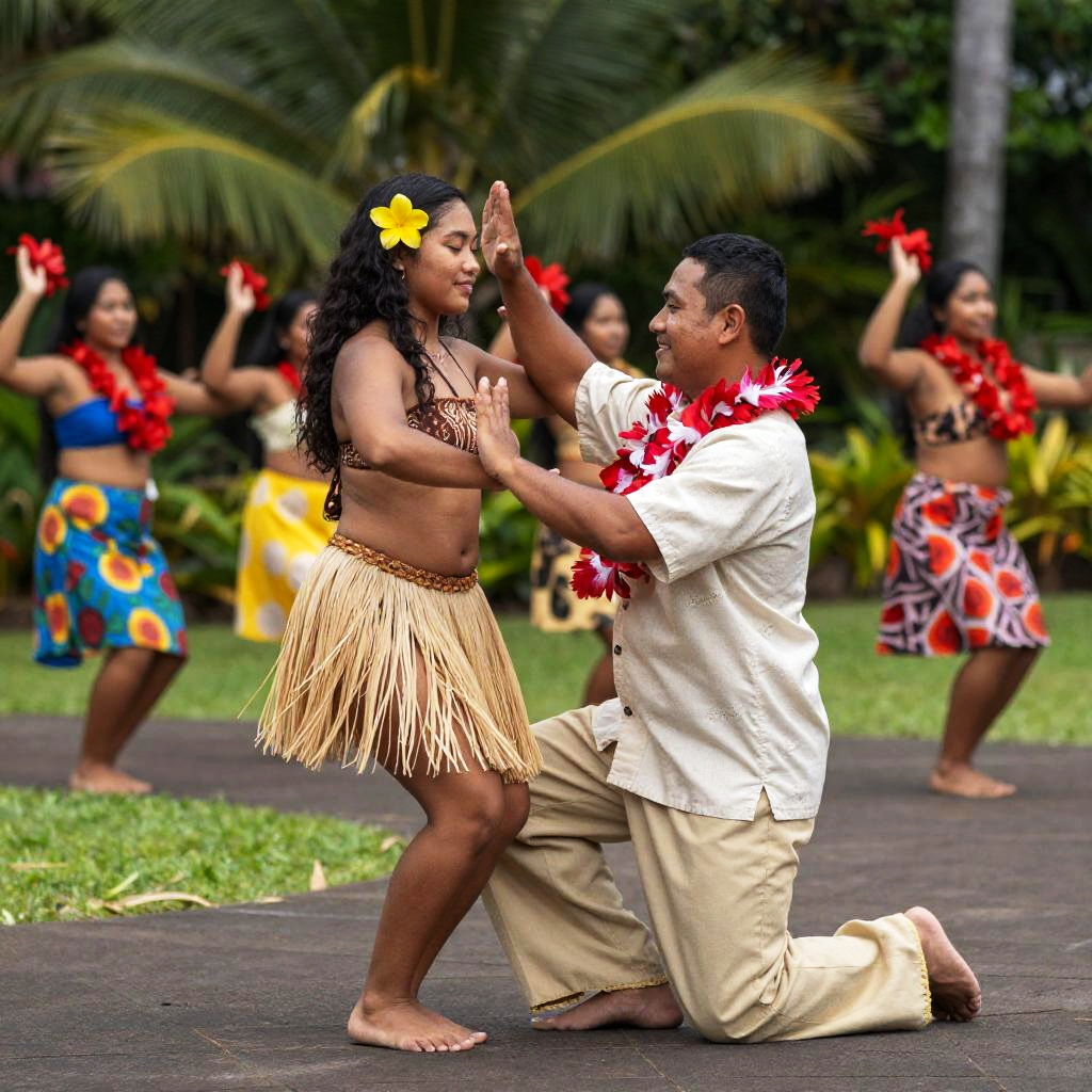 Photograph of a man and woman in traditional Hawaiian attire dancing. The man, kneeling, holds a red feather lei, smiling. The woman, with a yellow flower in her hair, wears a brown patterned bikini top, eyes closed. Several women in colorful dresses and red feather accessories dance in the background. Palm trees and lush greenery are visible. The man is wearing a beige shirt and khaki pants. The scene is outdoors, with a stone path and grassy area.