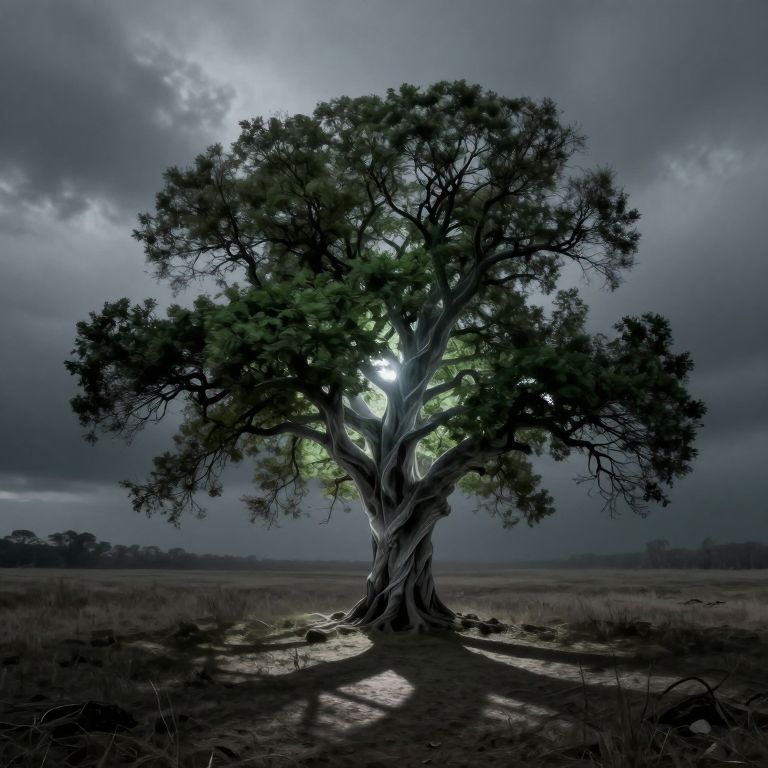 Photograph of a large, twisted tree with glowing green leaves under a dark, cloudy sky, casting long shadows on a flat, grassy plain.