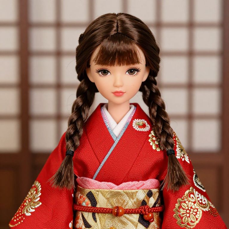 Asian doll with braids and a red kimono with gold embroidery.