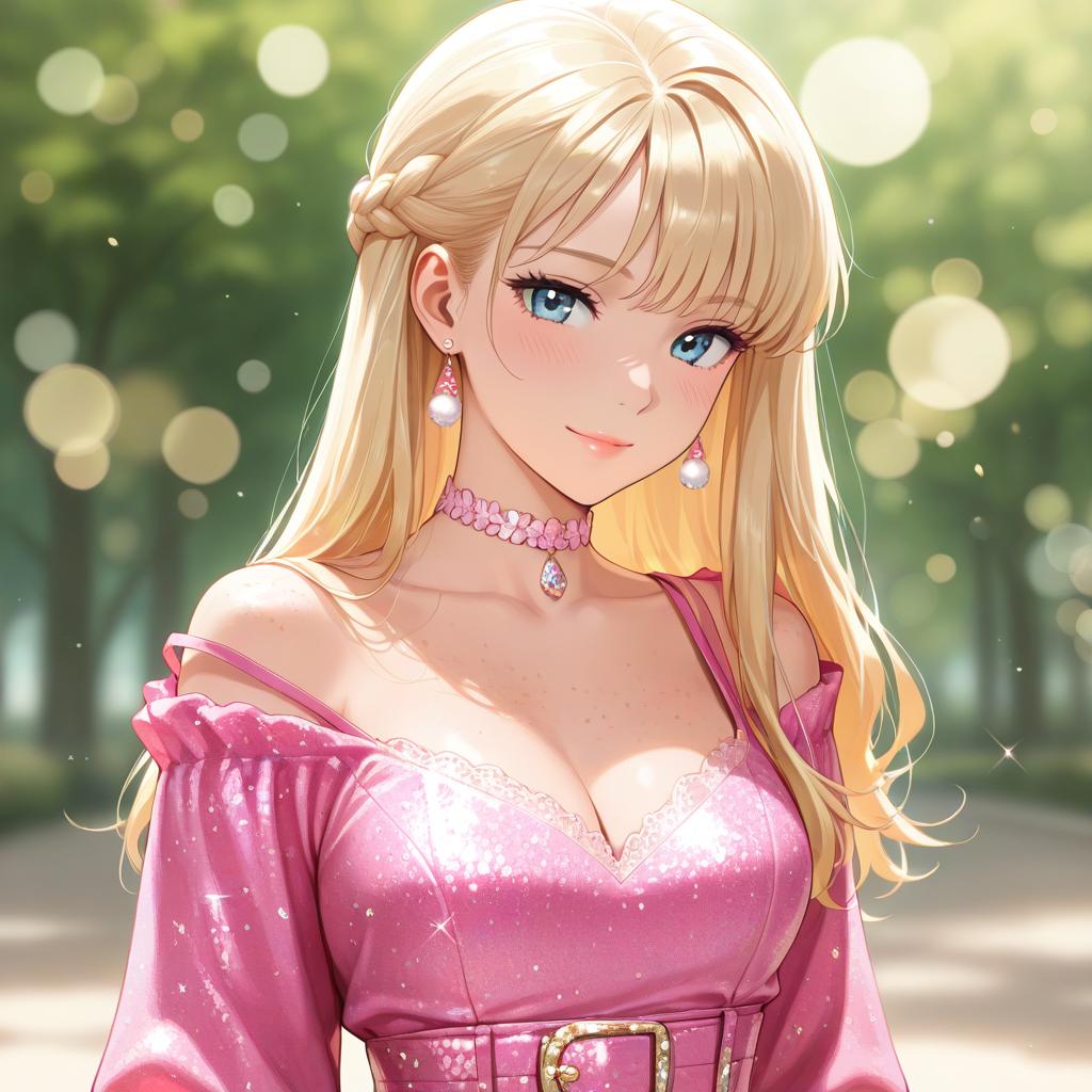 (masterpiece, best quality), 1girl, intricate details, print, earrings, freckles, upper body, bokeh, dappled sunlight, blonde, off shoulder, high-waist skirt, choker, looking at viewer, french braid, bangs, clothing cutout, glitter, particles, strap slip, barbie, pink dress