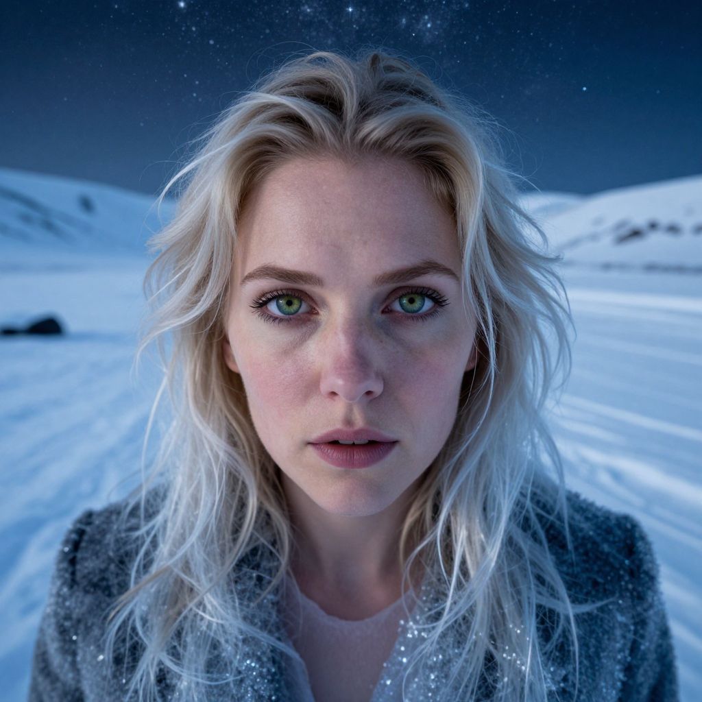 Photograph of a young Caucasian woman with long, wavy platinum blonde hair, fair skin, and striking green eyes. She has a serious expression and full lips. She is wearing a grey, furry coat. The background is a snowy landscape under a dark, star-filled night sky, with snowflakes gently falling. The image has a high contrast and cool color palette, emphasizing the cold environment. Her face is centered, with the snow-covered ground and distant snowdrifts visible behind her. The overall mood is intense and cold.