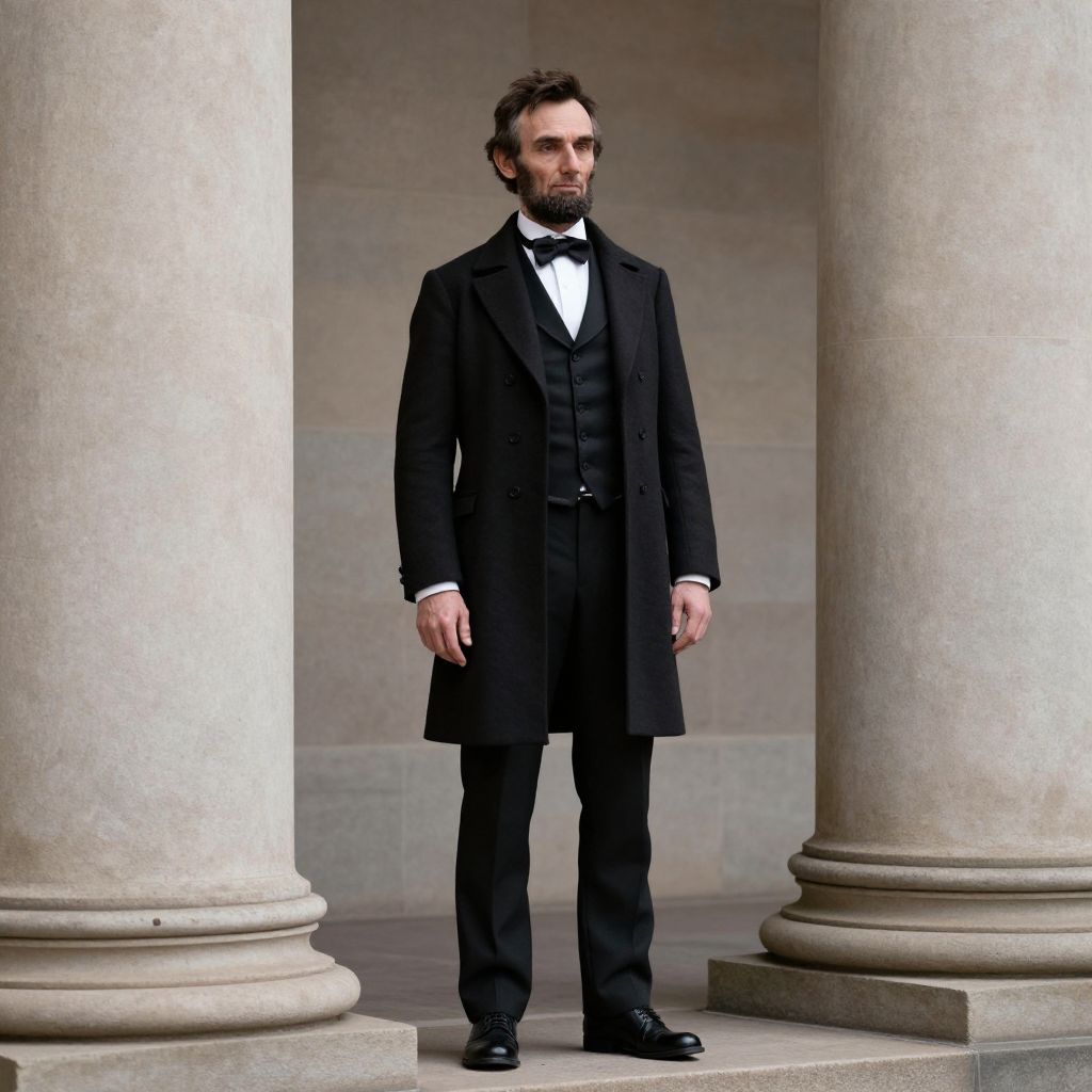Abraham lincoln adult, 1boy, solo, male focus, facial hair, beard, bow, pillar, bowtie, arm behind back, coat, mustache, full body, formal, standing, belt, column