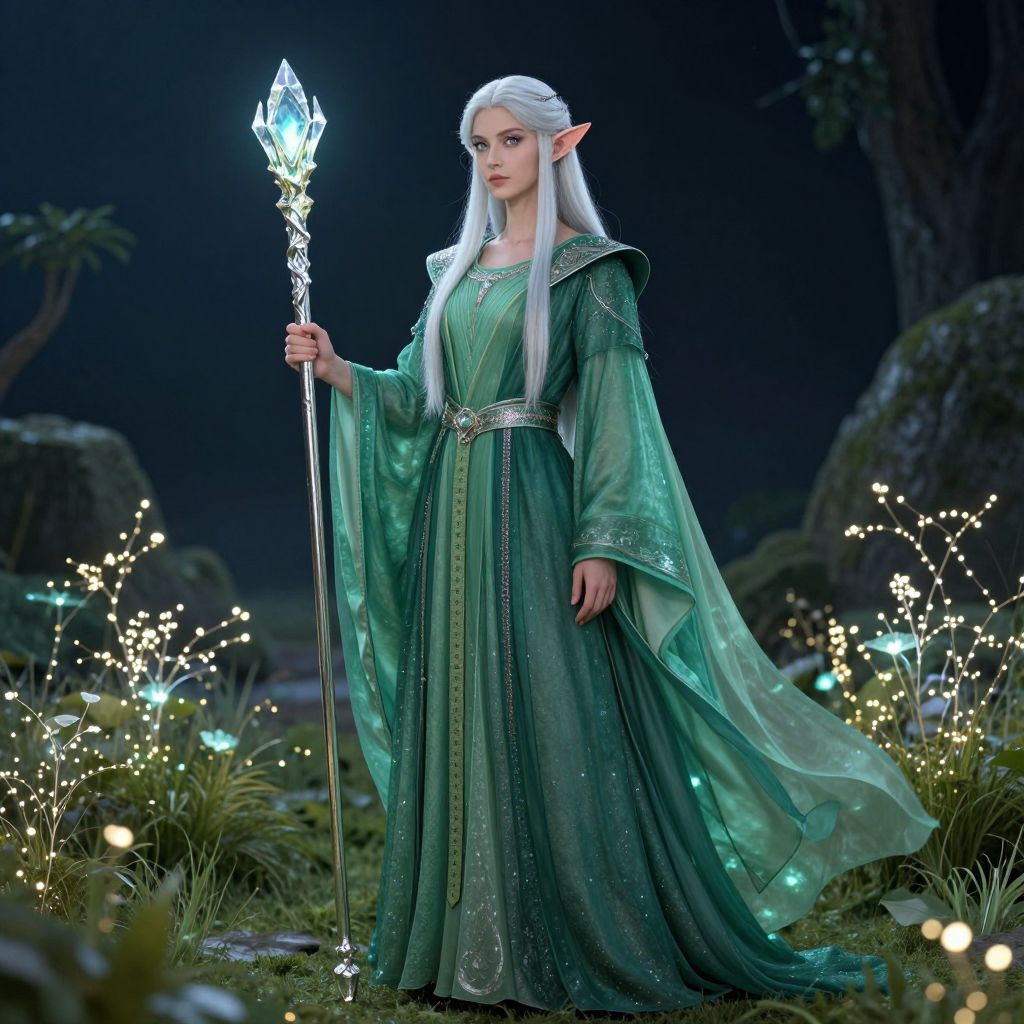 A digital fantasy artwork depicts a tall, slender elf woman with long, white, flowing hair and pointed ears. She stands in a glowing, enchanted forest at night, illuminated by fairy lights and bioluminescent plants. She wears a long, green, shimmering dress with intricate silver embroidery and holds a glowing, crystal-tipped staff. Her dress has wide, transparent sleeves. Her pale skin contrasts with the dark, mystical background of tall trees and soft, glowing lights. The elf's expression is calm and wise, enhancing the magical, otherworldly atmosphere of the scene.