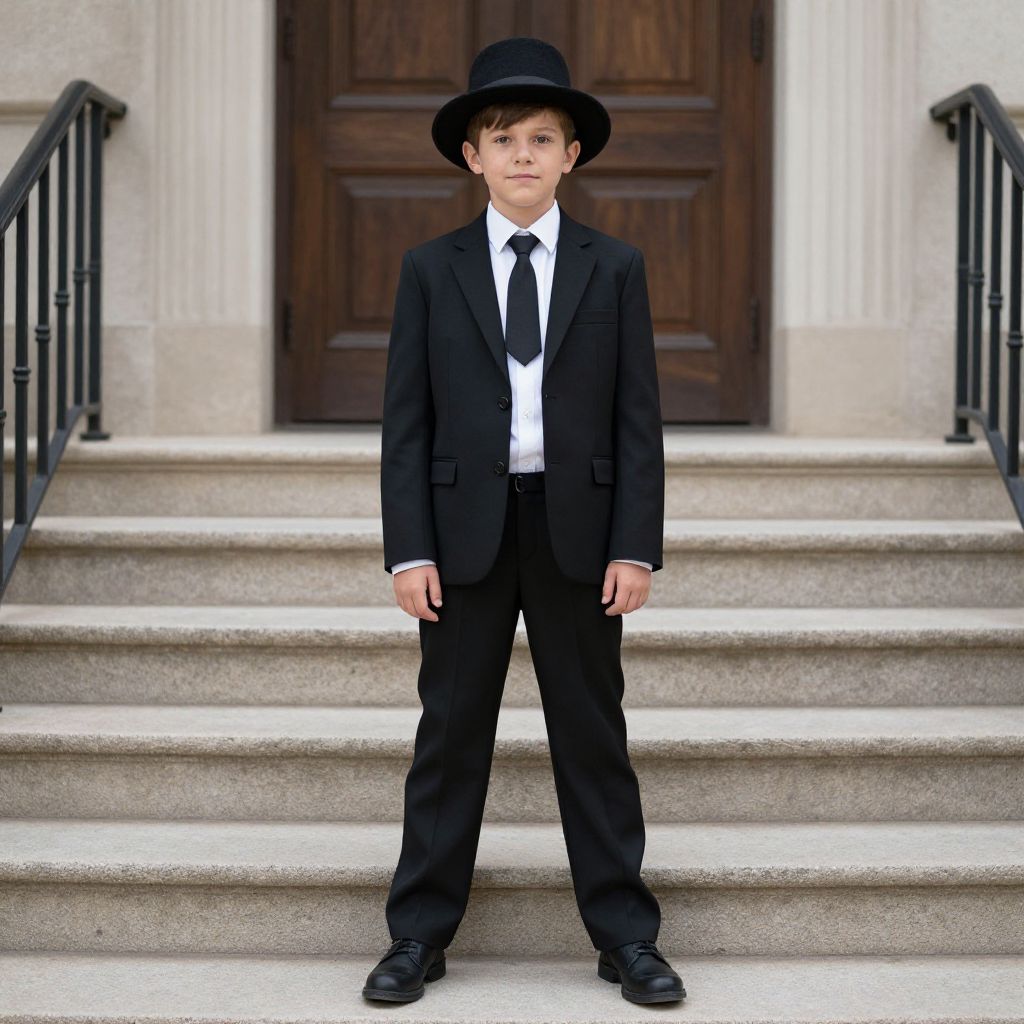 Photograph of a young boy standing on stone steps in front of a large wooden door. He is dressed in a formal black suit with a white shirt, black tie, and black bowler hat. His expression is neutral, and he stands with his arms slightly away from his body. The steps are flanked by black metal railings, and the background includes white stone walls. The lighting is natural, highlighting the boy's formal attire and the texture of the stone steps. The overall scene conveys a sense of formality and solemnity.