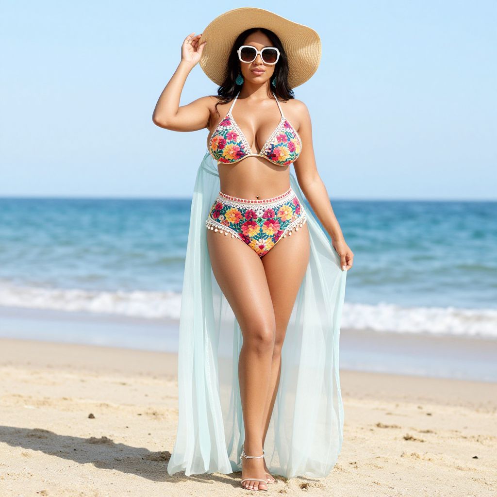 Full body shot, voluptuous woman, embroidered bikini set, vibrant floral patterns, soft cotton blend, adjustable halter neck, high-waisted bottom, intricate lace trim, pastel color palette, delicate bead accents, lightweight cover-up, sheer chiffon fabric, flowing maxi skirt, bohemian style, sun-kissed skin, beach backdrop, playful accessories, oversized straw hat, oversized sunglasses, beach sandals, relaxed pose Sexy. Pretty face and beаutiful eyes. Big breasts
