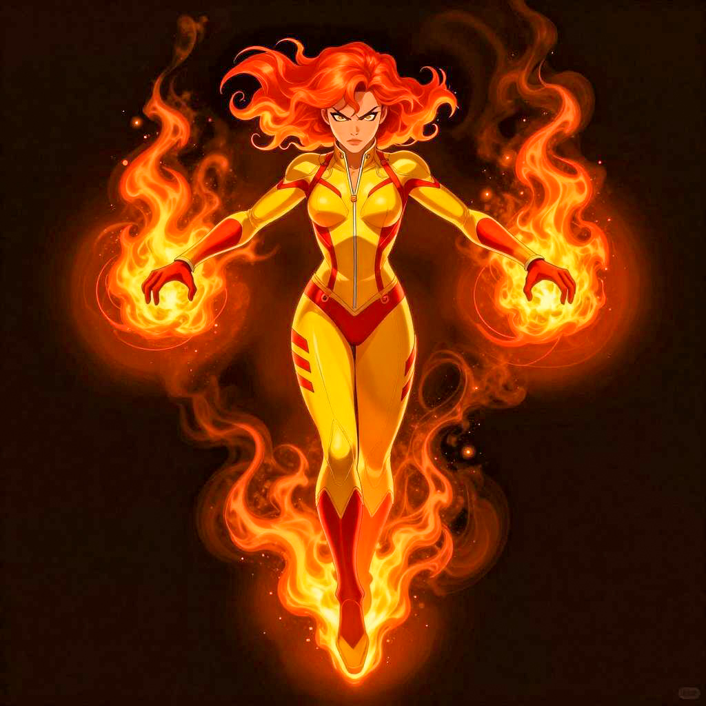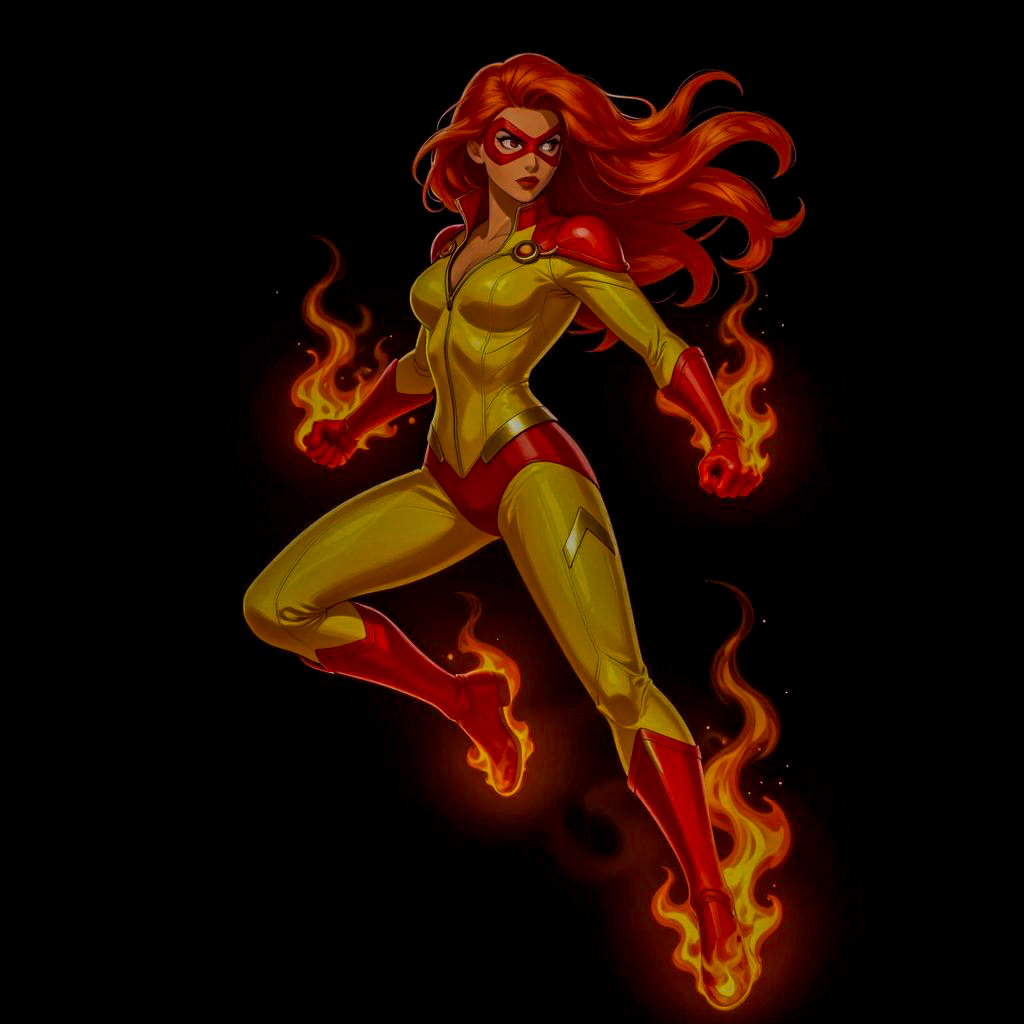 Illustration of a superhero woman with long red hair, wearing a yellow and red form-fitting suit, red gloves, and red boots. She has a red mask and flames on her wrists and feet. She is in a mid-air pose with flames extending from her feet. Black background. Detailed flames and suit ure. Single person. Intense expression.
