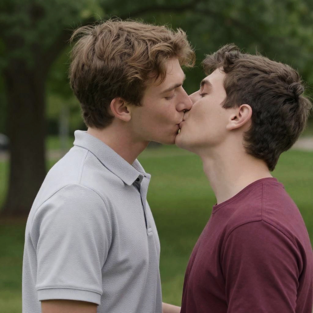 Close-up photograph of two men. Foreground man with short, light brown hair, white cap, and light blue face paint, tongue out, licking neck of second man. Second man has short, dark hair, plaid shirt, back turned. Background has brick building with large windows.
