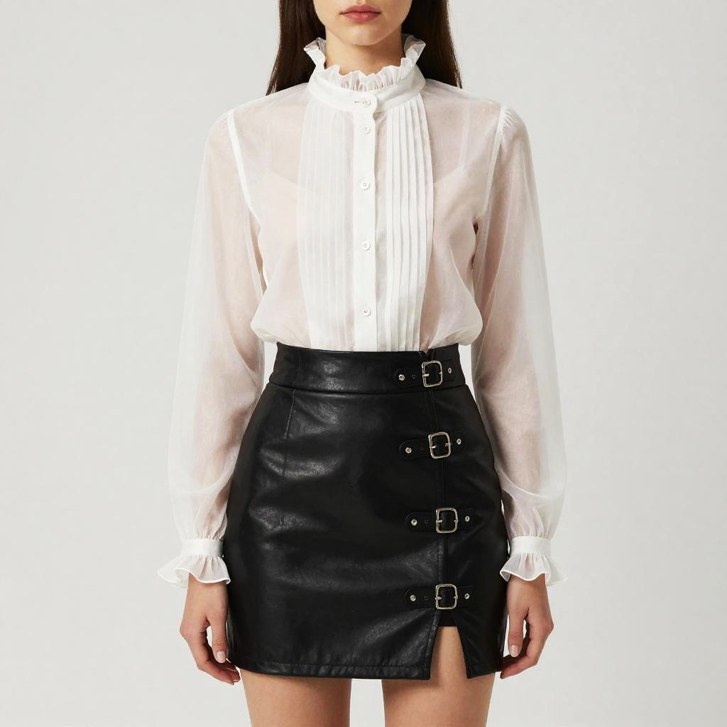 The woman wears a contemporary sheer white blouse featuring a ruffled high neck and pleated detailing, paired elegantly with a black leather mini skirt adorned with buckle accents. The outfit combines classic Victorian-inspired elements with modern edgy fashion for a striking look.