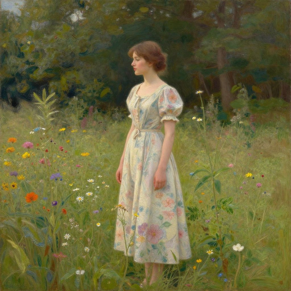 Photograph-style painting of a young woman with fair skin and brown hair in a floral dress, standing in a vibrant, wildflower-filled meadow with