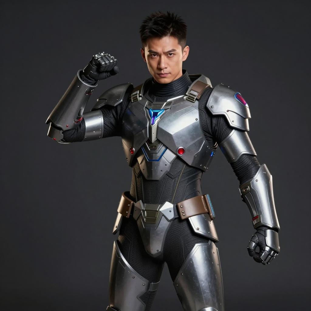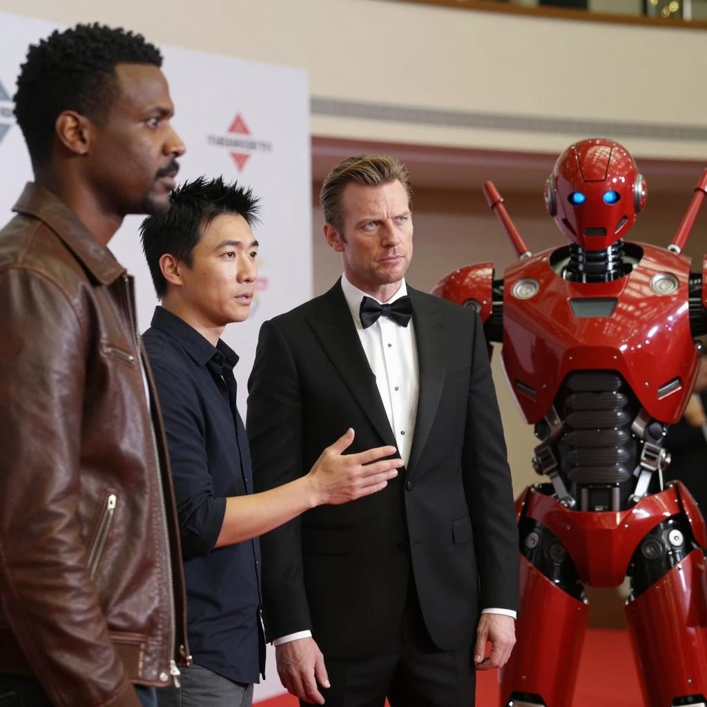 Four men in an indoor setting. Black man with short hair, mustache, leather jacket, leaning towards Asian man with black hair, dark shirt. White man with short hair, black tuxedo, stern expression. Red robot suit with helmet, standing. Background includes banners and architectural details. Asian man gestures with right hand.