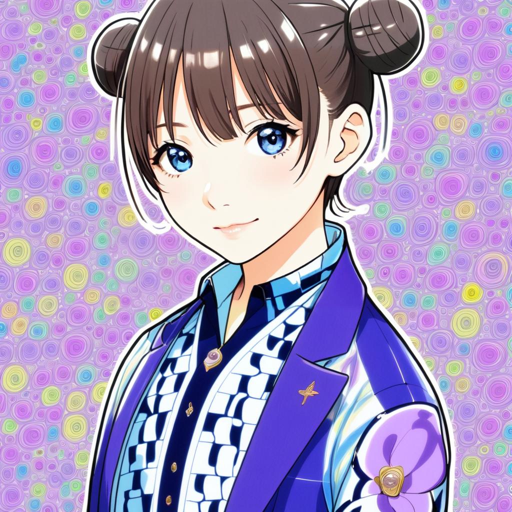 Munakata atsumi, idolmaster, 1girl, purple eyes, brown hair, short hair, double bun, by artist handsome wataru, anime