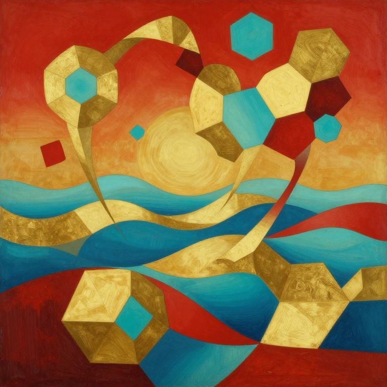 Craft an enchanting abstract geometric composition, drawing inspiration from Salvador Dali's surrealist masterpieces. Imagine soaring above a complex tapestry of interlocking hexagons and polygons in a vivid color spectrum featuring rich crimson, brilliant turquoise, and gleaming gold hues. These shapes twist and intertwine, defying traditional geometry as they create undulating waves that mimic the ebb and flow of ocean currents across the canvas. Infuse the piece with a subtle brushed metal texture to enhance its depth and intrigue, capturing the essence of movement and fluidity while maintaining structural balance. This mesmerizing dance of forms should transport viewers into a realm where dreams and reality intertwine in a harmonious blend of color and shape, evoking both awe and wonder as they traverse the emotional spectrum between chaos and order.