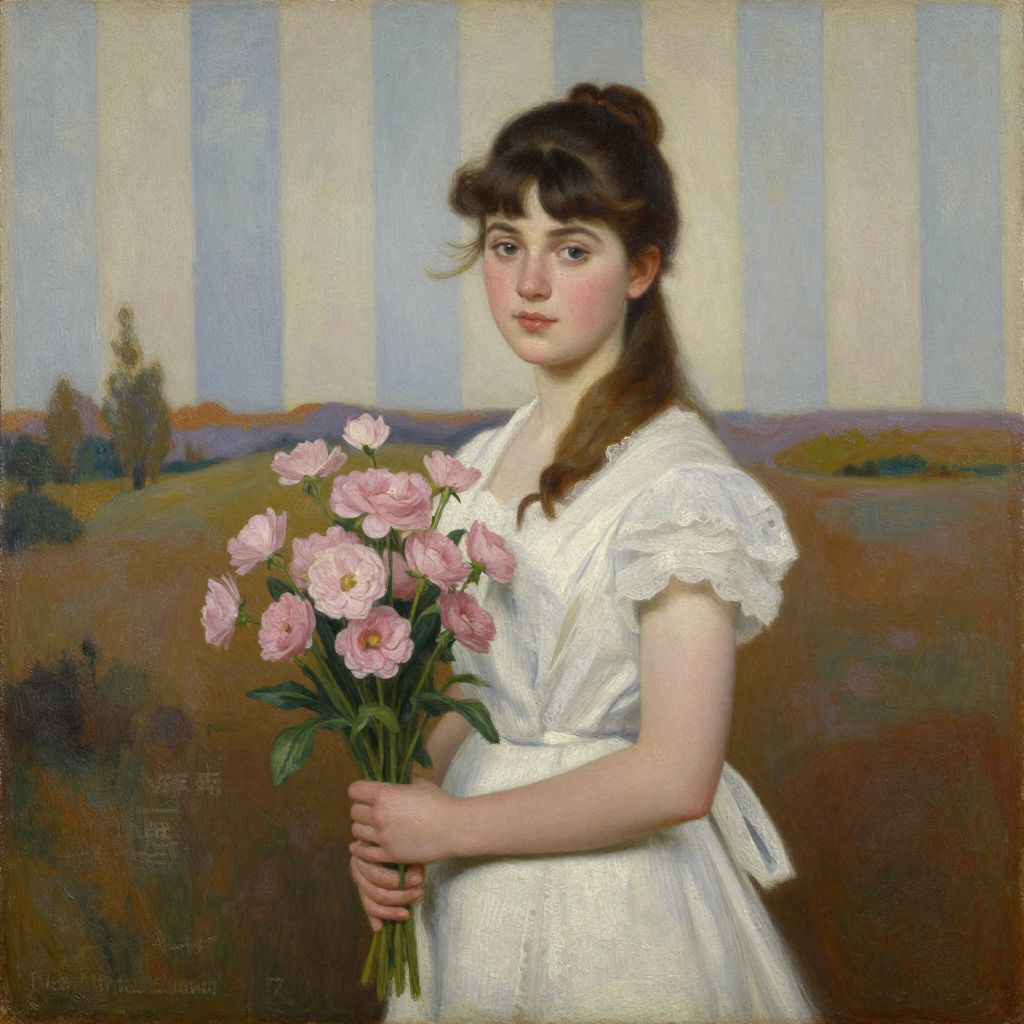 Painting of a young Caucasian woman with brown hair in a bun, wearing a white lace dress, holding pink carnations, standing in a pastoral landscape