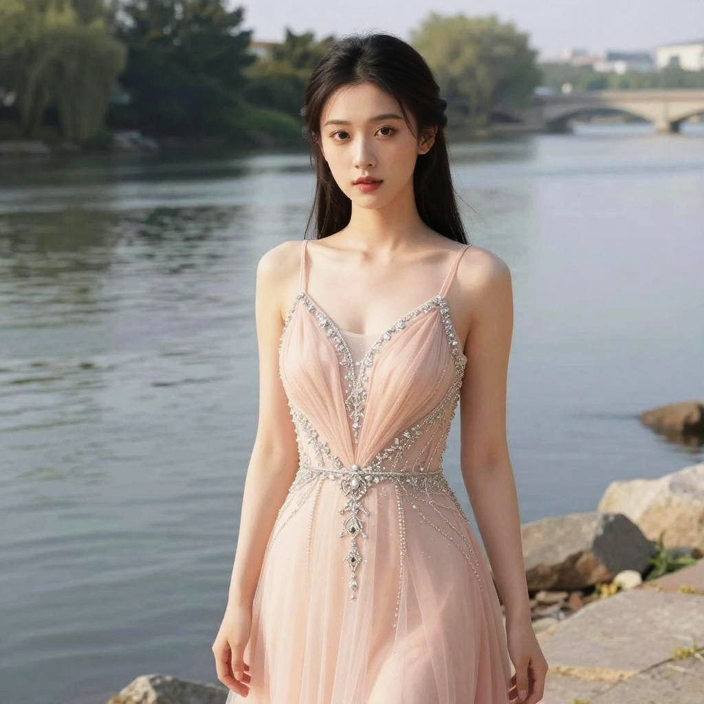 A woman in a digital manga style, wearing a peach floor-length gown with an illusion neckline and ornate silver beading, standing by a serene riverbank. Sexy. Pretty face and beutiful eyes