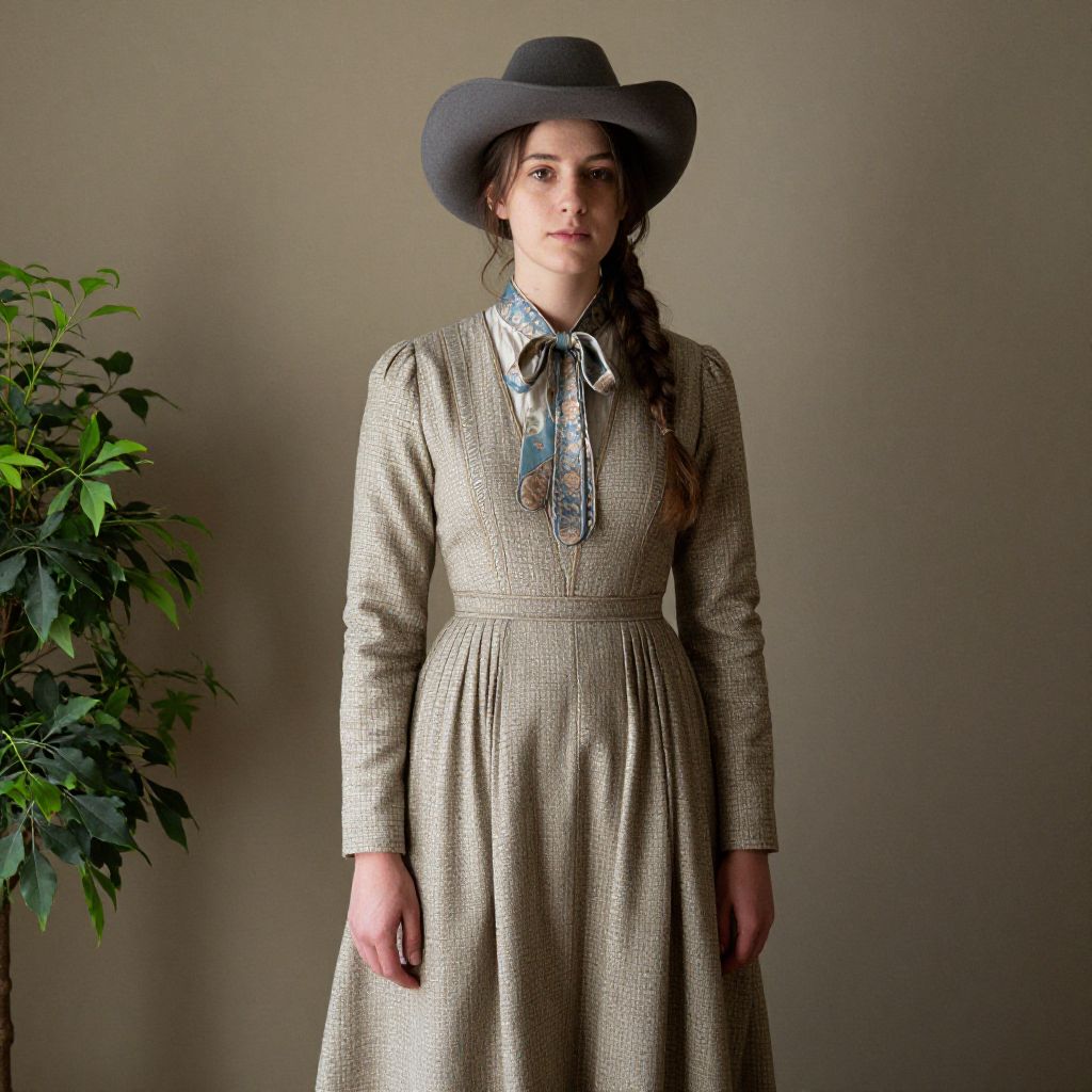 Old west woman costume, solo, dress, long sleeves, hat, 1girl, old, indoors, standing, plant, neck ribbon