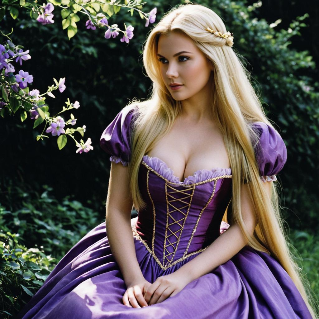 Ladies rapunzel costume ,1girl, dress, solo, blonde hair, long hair, purple dress, gown, flower, breasts, lips, short sleeves