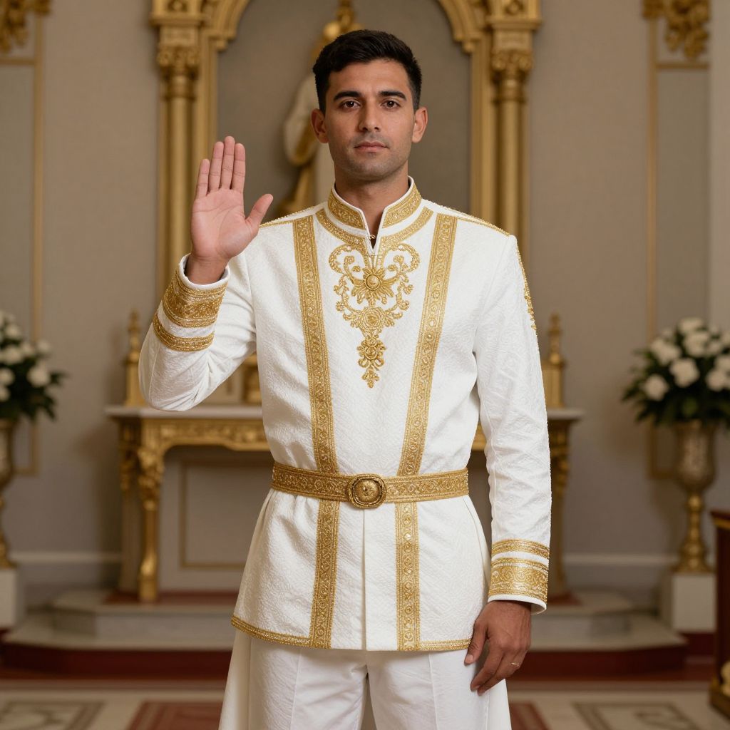 Photograph of a young South Asian man with short, dark hair and a medium build, standing in an ornately decorated room. He is wearing a white, long-sleeved, traditional dress with gold embroidery on the chest, cuffs, and belt. His right hand is raised in a gesture of greeting or respect. The background features a gold-framed archway, white flowers in vases, and a red carpet. The room has a formal, elegant atmosphere with soft, warm lighting. The man's expression is neutral, and he is centered in the frame.