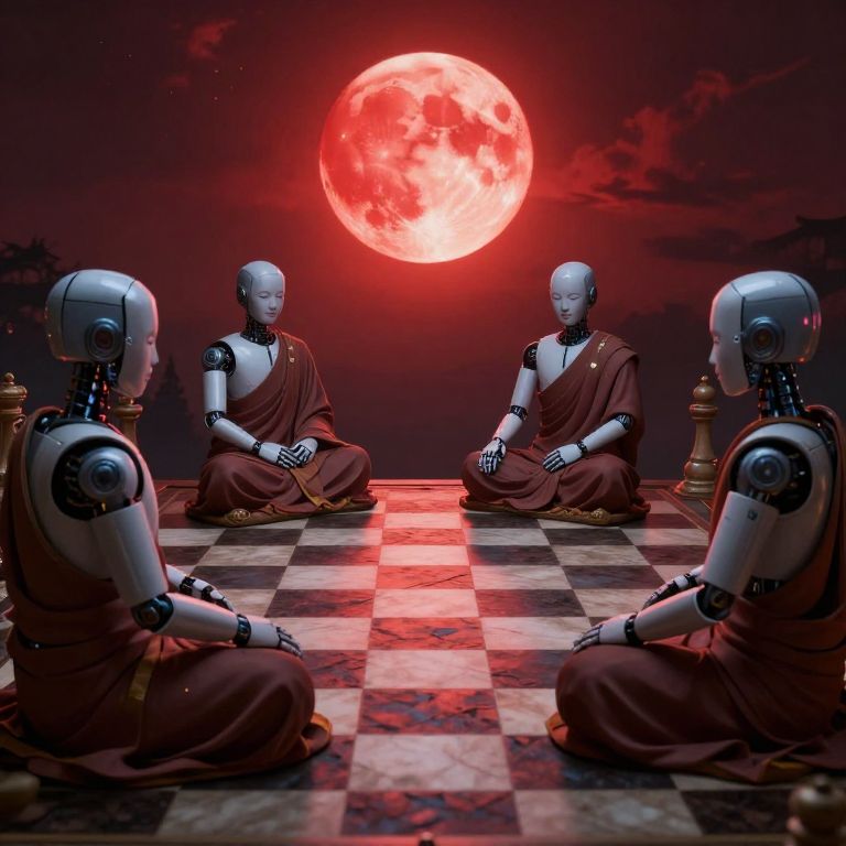 Silent robotic monks sit in meditation on a massive, checkered chessboard, their serene postures framed by the fiery glow of a blood-red moon above, casting an otherworldly light that illuminates their tranquil yet enigmatic presence.