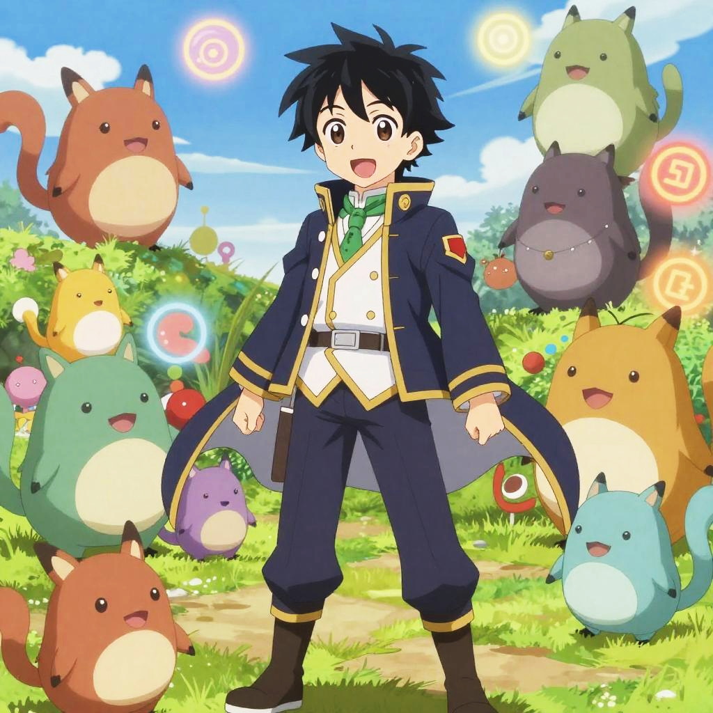 Anime-style drawing of a black-haired boy in a navy and gold military-style coat surrounded by colorful, floating Totoro-like creatures in a bright,